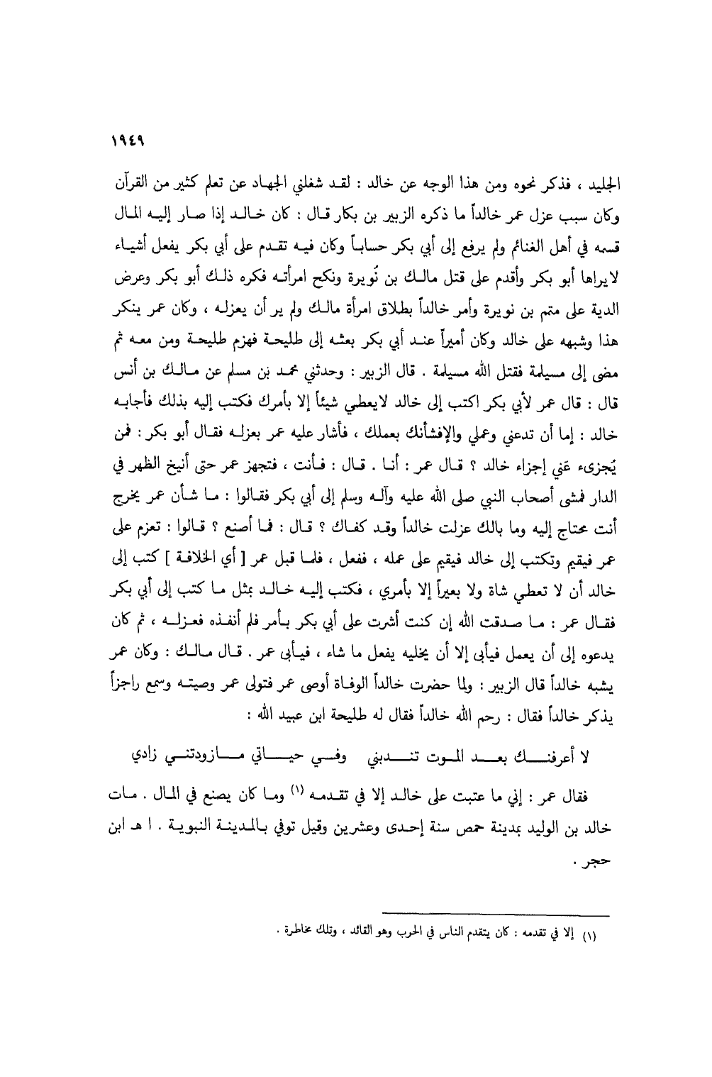 الجليد، فذكر نحوه ومن هذا الوجه عن خالد: لقد شغلني الجهاد عن تعلم كثير من القرآن وكان سبب عزل عمر خالداً ما ذكره الزبير بن بكار قال: كان خالد إذا صار إليه المال قسمه في أهل الغنائم ولم يرفع إلى أبي بكر حساباً وكان فيه تقدم على أبي بكر يفعل أشياء لا يراها أبو بكر وأقدم على قتل مالك بن نويرة ونكح امرأته فكره ذلك أبو بكر وعرض الدية على متمم بن نويرة وأمر خالداً بطلاق امرأة مالك ولم ير أن يعزله، وكان عمر ينكر هذا وشبهه على خالد وكان أميراً عند أبي بكر بعثه إلى طليحة فهزم طليحة ومن معه ثم مضى إلى مسيلمة فقتل الله مسيلمة. قال الزبير: وحدثني محمد بن مسلم عن مسلم بن أنس قال: قال عمر لأبي بكر اكتب إلى خالد لا يعطي شيئاً إلا بأمرك فكتب إليه بذلك فأجابه خالد: إما أن تدعيني وعملي والإ فشأنك بعملك، فأشار عليه عمر بعزله فقال أبو بكر: فمن يجزئ عني إجزاء خالد، قال عمر: أنا. قال: فأنت، فتجهز عمر حتى أنييخ الظهر في الدار فمشى أصحاب النبي صلى الله عليه وآله وسلم إلى أبي بكر فقالوا: ما شأن عمر يخرج أنت محتاج إليه وما بالك عزلت خالداً وقد كفاك؟ قال: فما أصنع؟ قالوا: تعزم على عمر فيقيم وتكتب إلى خالد فيقيم على عمله، ففعل، فلما قبل عمر [أي الخلافة] كتب إلى خالد أن لا تعطي شاة ولا بعيراً إلا بأمري، فكتب إليه خالد بمثل ما كتب إلى أبي بكر فقال عمر: ما صدقت الله إن كنت أشرت على أبي بكر بأمر فلم أنفذه فعزله، ثم كان يدعوه إلى أن يعمل فيأبى إلا أن يخليه يفعل ما شاء، فيأبى عمر. قال مالك: وكان عمر يشبه خالداً قال الزبير: ولما حضرت خالداً الوفاة أوصى عمر فتولى عمر وصيته وسمع راجزاً يذكر خالداً فقال: رحم الله خالداً فقال له طليحة ابن عبيد الله:
