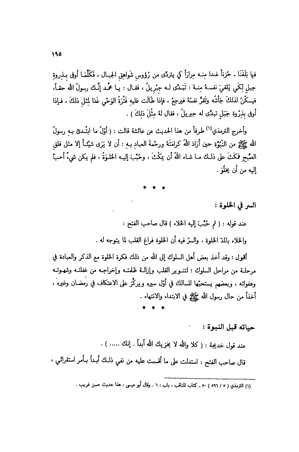 وأخرج الترمذي (1) طرفاً من هذا الحديث عن عائشة قالت: (أول ما ابتُدئ به رسول الله صلى الله عيه وسلم من النبوة حين أراد الله كرامته ورحمة العباد به: أن لا يرى شيئاً إلا مثل فلق الصبح فمكث على ذلك ما شاء الله أن يمكث، وحبب إليه الخلوة، فلم يكن شيء أحب إليه من أن يخلو.
