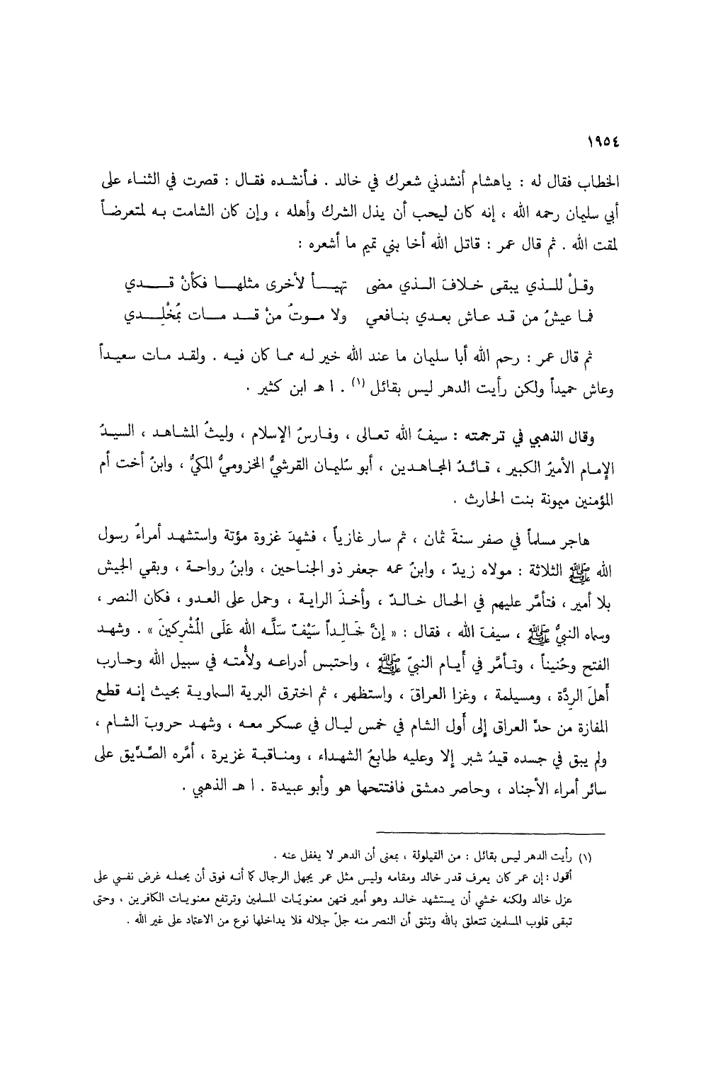 الخطاب فقال له: يا هشام أنشدني شعرك في خالد. فأنشده فقال: قصرت في الثناء على أبي سليمان رحمه الله، إنه كان ليحب أن يذل الشرك وأهله، وإن كان الشامت به لمتعرضاً لمقت الله. ثم قال عمر: قاتل الله أخا بني تميم ما أشعره: