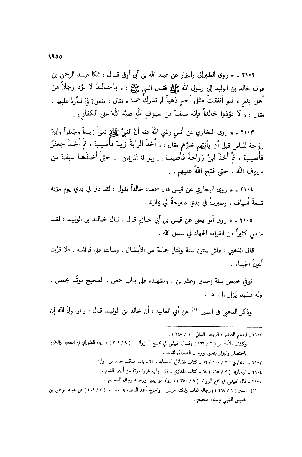 2104 - * روى البخاري عن قيس قال سمعت خالداً يقول: لقد دق في يدي يوم مؤتة تسعة أسياف، وصبرت في يدي صفيحة لي يمانية.