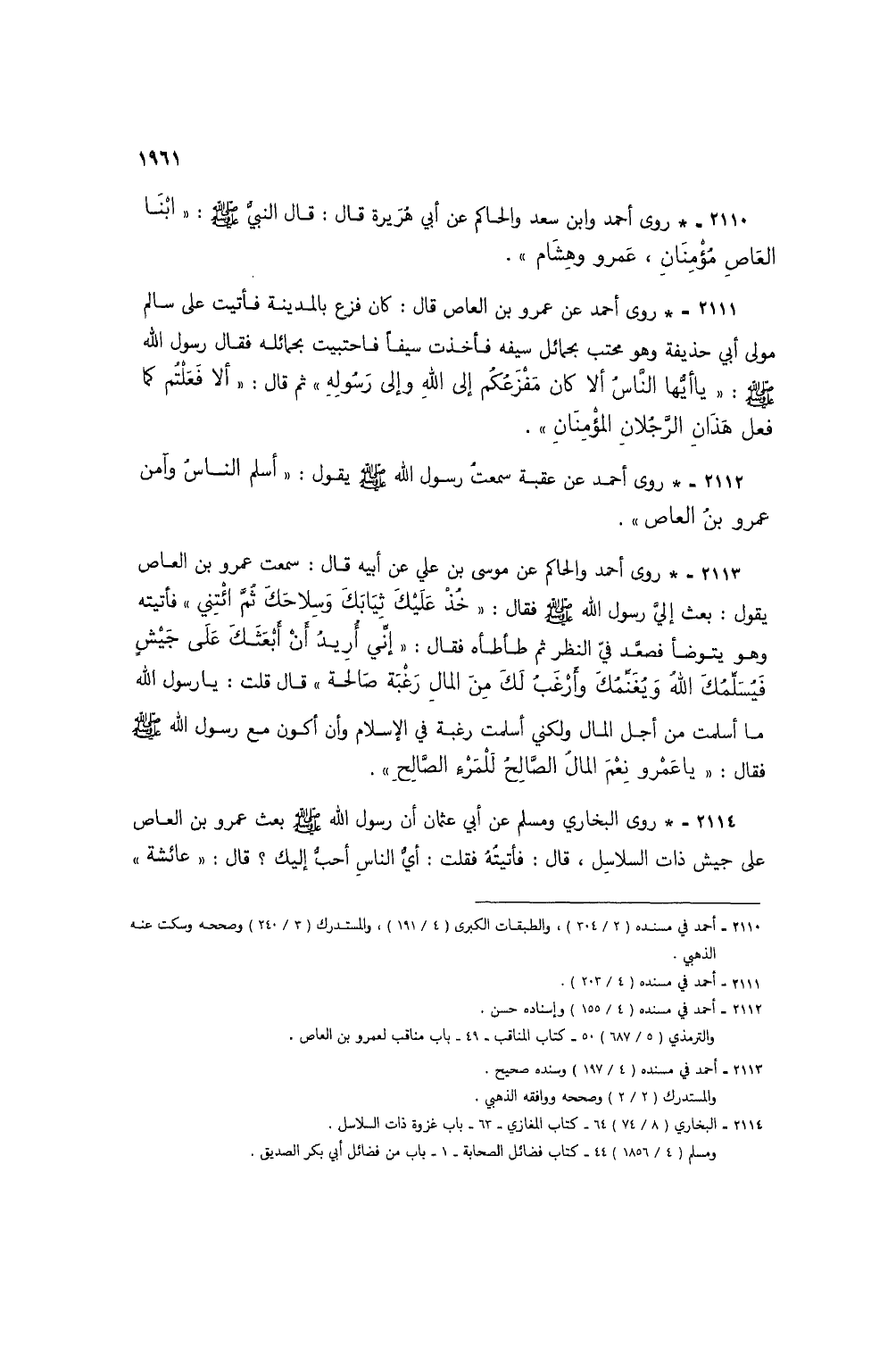 2110 - * روى أحمد وابن سعد والحاكم عن أبي هريرة قال: قال النبي صلى الله عليه وسلم: "ابنا العاص مؤمنان، عمرو وهشام".