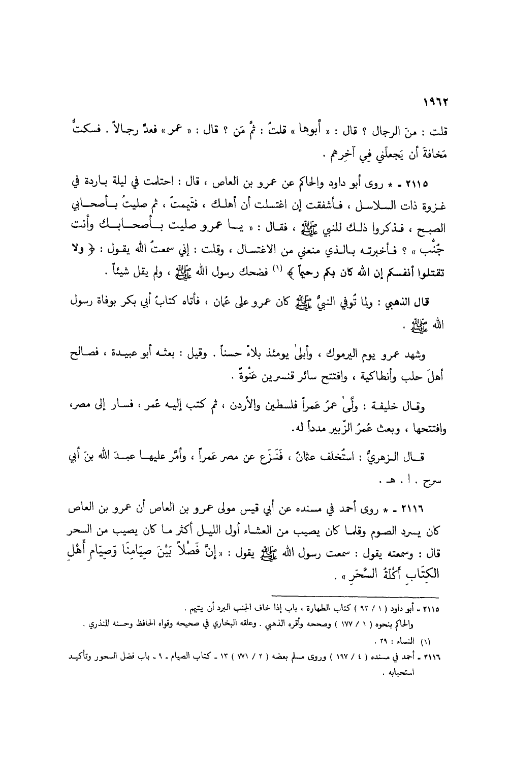 2115 - * روى أبو داود والحاكم عن عمرو بن العاص، قال: احتلمت في ليلة باردة في غزوة ذات السلاسل، فأشفقت إن اغتسلت أن أهلك، فتيممت. ثم صليت بأصحابي الصبح، فذكروا ذلك للنبي صلى الله عليه وسلم، فقال: "يا عمرو صليت بأصحابك وأنت جنب"؟ فأخبرته بالذي منعني من الاغتسال، وقلت: إني سمعت الله يقول: {وَلَا تَقْتُلُوا أَنْفُسَكُمْ إِنَّ اللَّهَ كَانَ بِكُمْ رَحِيمًا} (1) فضحك رسول الله صلى الله عليه وسلم، ولم يقل شيئًا.