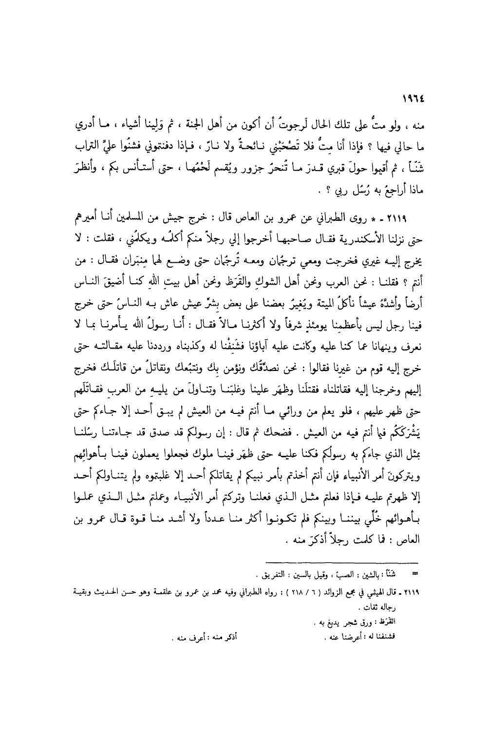 2119 - * روى الطبراني عن عمرو بن العاص قال: خرج جيش من المسلمين أنا أميرهم حتى نزلنا الإسكندرية فقال صاحبها أخرجوا إلي رجلاً منكم أكلمه ويكلمني، فقلت: لا يخرج إليه غيري فخرجت ومعي ترجمان ومعه ترجمان نتبعك ونقاتل من قاتلك فخرج إليهم وخرجنا إليه فقاتلناه فقتلنا وظهر علينا وغلبنا وتناول من يليه من العرب فقاتلهم حتى ظهر عليهم، فلو يعلم من ورائي ما أنتم فيه من العيش لم يبق أحد إلا جاءكم حتى يشرككم فيما أنتم فيه من العيش. فضحك ثم قال: إن رسولكم قد صدق قد جاءتنا رسلنا بمثل الذي جاءكم به رسولكم فكنا عليه حتى ظهر فينا ملوك فجعلوا يعملون فينا بأهوائهم ويتركون أمر الأنبياء فإن أنتم أخذتم بأمر نبيكم لم يقاتلكم أحد إلا غلبتموه ولم يتناولكم أحد إلا ظهرتم عليه فإذا فعلتم مثل الذي فعلنا وتركتم أمر الأنبياء وعملتهم مثل الذي عملوا بأهوائهم خلي بيننا وبينكم فلم تكونوا أكثر منا عددًا ولا أشد منا قوة قال عمرو بن العاص: فما كلمت رجلاً أذكر منه.
