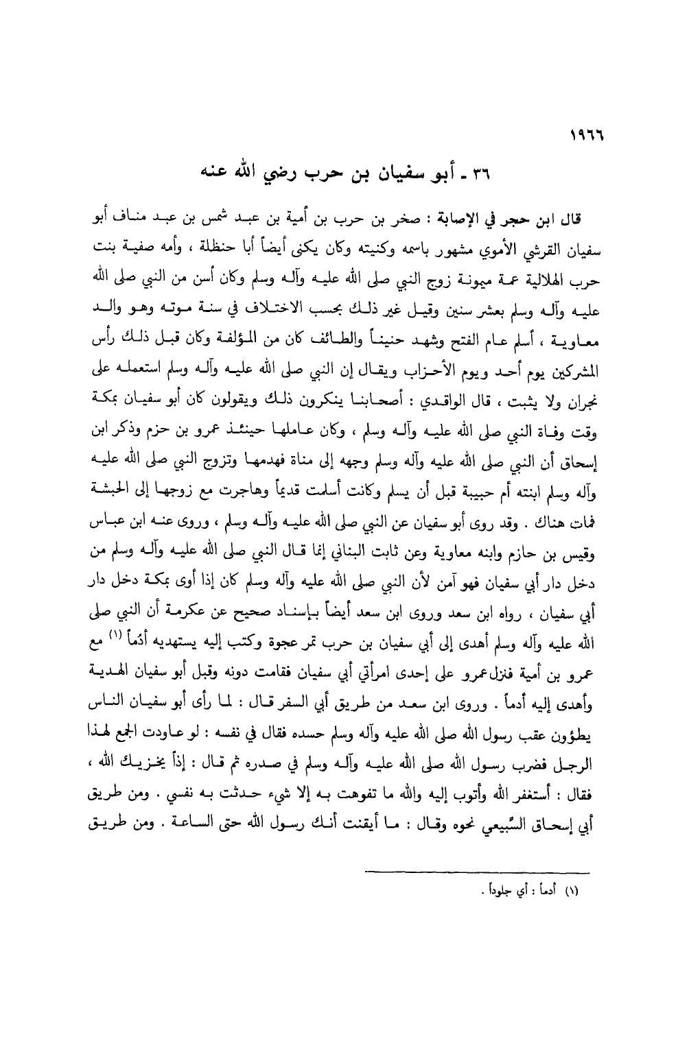 قال ابن حجر في الإصابة: صخر بن حرب بن أمية بن عبد شمس بن عبد مناف أبو سفيان القرشي الأموي مشهور باسمه وكنيته وكان يكنى أيضًا أبا حنظلة، وأمه صفية بنت حرب الهلالية عمة ميمونة زوج النبي صلى الله عليه وآله وسلم وكان أسن من النبي صلى الله عليه وآله وسلم بعشر سنين وقيل غير ذلك بحسب الاختلاف في سنة موته وهو والد معاوية، أسلم عام الفتح وشهد حنينًا والطائف كان من المؤلفة وكان قبل ذلك رأس المشركين يوم أحد ويوم الأحزاب ويقال إن النبي صلى الله عليه وآله وسلم استعمله على نجران ولا يثبت، قال الواقدي: أصحابنا ينكرون ذلك ويقولون كان أبو سفيان بمكة وقت وفاة النبي صلى الله عليه وآله وسلم، وكان عاملها حينئذ عمرو بن حزم وذكر ابن إسحاق أن النبي صلى الله عليه وآله وسلم وجهه إلى مناة فهدمها وتزوج النبي صلى الله عليه وآله وسلم ابنته أم حبيبة قبل أن يسلم وكانت أسلمت قديمًا وهاجرت مع زوجها إلى الحبشة فمات هناك. وقد روى أبو سفيان عن النبي صلى الله عليه وآله وسلم، وروى عنه ابن عباس وقيس بن حازم وابنه معاوية وعن ثابت البناني إنما قال النبي صلى الله عليه وآله وسلم من دخل دار أبي سفيان فهو آمن لأن النبي صلى الله عليه وآله وسلم كان إذا أوى بمكة دخل دار أبي سفيان، رواه ابن سعد وروى ابن سعد أيضًا بإسناد صحيح عن عكرمة أن النبي صلى الله عليه وآله وسلم أهدى إلى أبي سفيان بن حرب تمر عجوة وكتب إليه يستهديه أدمًا (1) مع عمرو بن أمية فنزل عمرو على إحدى امرأتي أبي سفيان فقامت دونه وقبل أبو سفيان الهدية وأهدى إليه أدمًا. وروى ابن سعد من طريق أبي السفر قال: لما رأى أبو سفيان الناس يطؤون عقب رسول الله صلى الله عليه وآله وسلم حسده فقال في نفسه: لو عاودت الجمع لهذا الرجل فضرب رسول الله صلى الله عليه وآله وسلم في صدره ثم قال: إذا يخزيك الله، فقال: أستغفر الله وأتوب إليه والله ما تفوهت به إلا شيء حدثت به نفسي. ومن طريق أبي إسحاق السبيعي نحوه وقال: ما أيقنت أنك رسول الله حتى الساعة. ومن طريق