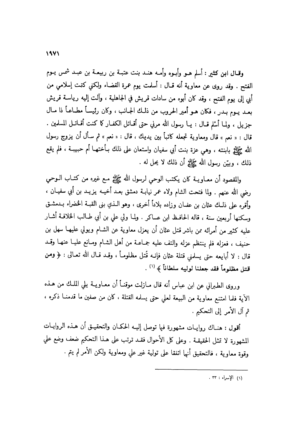 وروى الطبراني عن ابن عباس أنه قال ما زلت موقنًا أن معاوية يلي الملك من هذه الآية فلما امتنع معاوية من البيعة لعلي حتى يسلمه القتلة، كان من صفين ما قدمنا ذكره، ثم آل الأمر إلى التحكيم.
