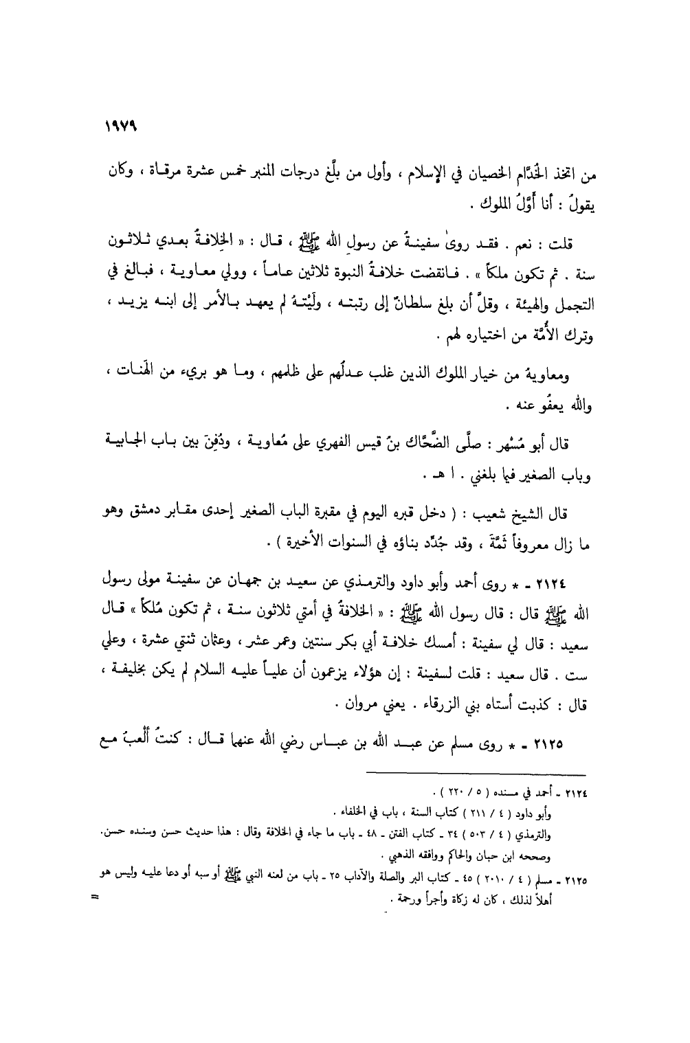 2124 - * روى أحمد وأبو داود والترمذي عن سعيد بن جمهان عن سفينة مولى رسول الله صلى الله عليه وسلم قال: قال رسول الله صلى الله عليه وسلم: "الخلافة في أمتي ثلاثون سنة، ثم تكون ملكًا" قال سعيد: قال لي سفينة: أمسك خلافة أبي بكر سنتين وعمر عشر، وعثمان ثنتي عشرة، وعلي ست. قال سعيد: قلت لسفينة: إن هؤلاء يزعمون أن عليًا عليه السلام لم يكن بخليفة، قال: كذبت أستاه بني الزرقاء. يعني مروان.