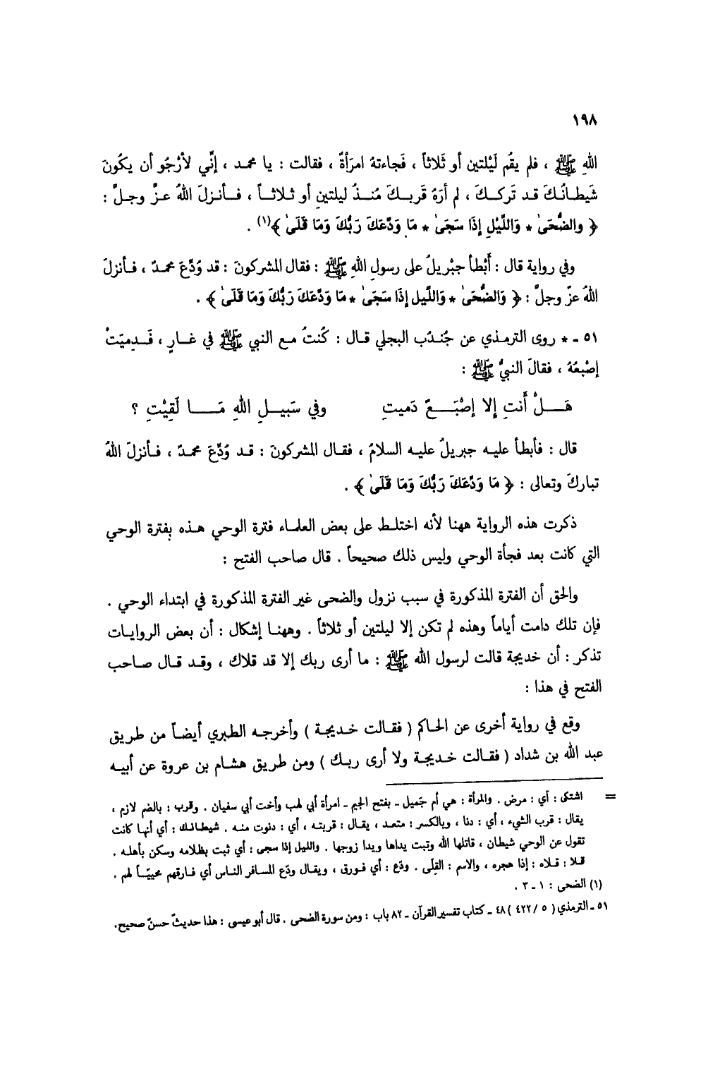 والحق أن الفترة المذكورة في سبب نزول والضحى غير الفترة المذكورة في ابتداء الحي. فإن تلك دامت أياماً وهذه لم تكن إلا ليلتين أو ثلاثاً. وههنا إشكال: أن بعض الروايات تذكر: أن خديجة قالت رسول الله صلى الله عليه وسلم: ما أرى ربك إلا قد قلاك، وقد قال صاحب الفتح في هذا: