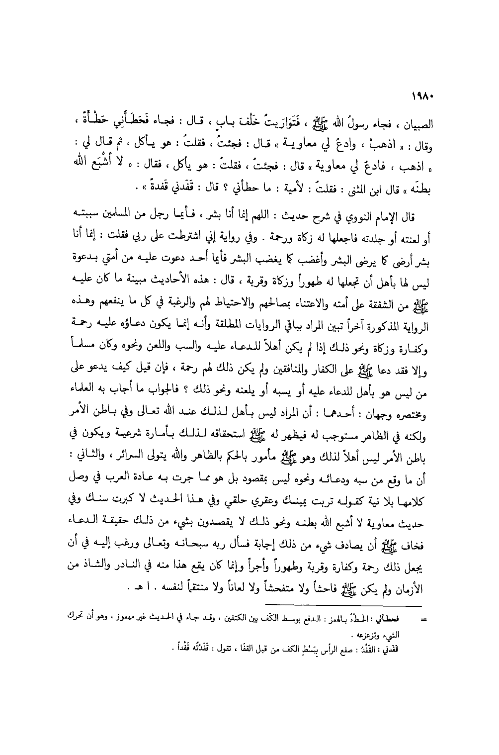 قال الإمام النووي في شرح حديث: اللهم إنما أنا بشر، فأيما رجل من المسلمين سببته أو لعنته أو جلدته فاجعلها له زكاة ورحمة. وفي رواية إني اشترطت على ربي فقلت: إنما أنا بشر أرضى كما يرضى البشر وأغضب كما يغضب البشر فأيما أحد دعوت عليه من أمتي بدعوة ليس لها بأهل أن تجعلها له طهورًا وزكاة وقربة، قال: هذه الأحاديث مبينة ما كان عليه صلى الله عليه وسلم من الشفقة على أمته والاعتناء بمصالحهم والاحتياط لهم والرغبة في كل ما ينفعهم وهذه الرواية المذكورة آخرًا تبين المراد بباقي الروايات المطلقة وأنه إنما يكون دعاؤه عليه رحمة وكفارة وزكاة ونحو ذلك إذا لم يكن أهلاً للدعاء عليه والسب واللعن ونحوه وكان مسلمًا وإلا فقد دعا صلى الله عليه وسلم على الكفار والمنافقين ولم يكن ذلك لهم رحمة، فإن قيل كيف يدعو على من ليس هو بأهل للدعاء عليه أو يسبه أو يلعنه ونحو ذلك؟ فالجواب ما أجاب به العلماء ومختصره وجهان: أحدهما: أن المراد ليس بأهل لذلك عند الله تعالى وفي باطن الأمر ولكنه في الظاهر مستوجب له فيظهر له صلى الله عليه وسلم استحقاقه لذلك بأمارة شرعية ويكون في باطن الأمر ليس أهلاً لذلك وهو صلى الله عليه وسلم استحقاقه لذلك بأمارة شرعية ويكون في باطن الأمر ليس أهلاً لذلك وهو صلى الله عليه وسلم مأمور بالحكم بالظاهر والله يتولى السرائر، والثاني: أن ما وقع من سبه ودعائه ونحوه ليس بمقصود بل هو مما جرت به عادة العرب في وصل كلامها بلا نية كقوله تربت يمينك وعقري حلقي وفي هذا الحديث لا كبرت سنك وفي حديث معاوية لا أشبع الله بطنه ونحو ذلك لا يقصدون بشيء من ذلك حقيقة الدعاء فخاف صلى الله عليه وسلم أن يصادف شيء من ذلك إجابة فسأل ربه سبحانه وتعالى ورغب إليه في أن يجعل ذلك رحمة وكفارة وقربة وطهورًا وأجرًا وإنما كان يقع هذا منه في النادر والشاذ من الأزمان ولم يكن صلى الله عليه وسلم فاحشًا ولا متفحشًا ولا لعانًا ولا منتقمًا لنفسه. اهـ.