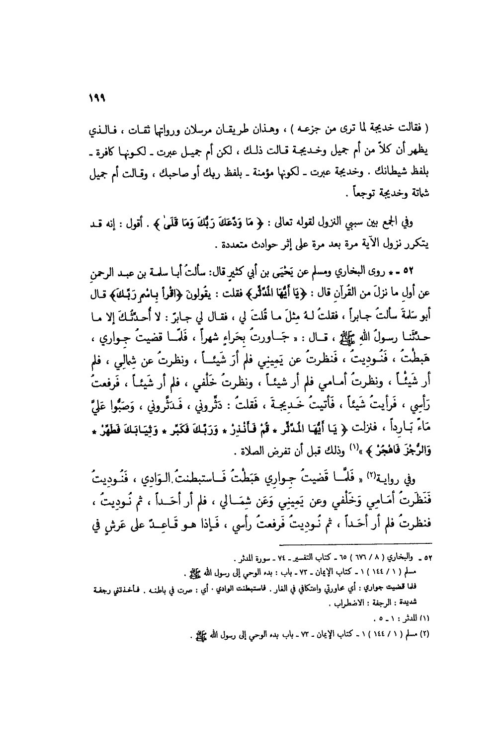 (فقالت خديجة لما ترى من جزعه)، وهذان طريقان مرسلان ورواتهما ثقات، فالذي يظهر أن كلاً من أم جميل وخديجة قالت ذلك، لكن أم جميل عبرت - لكونها كافرة - بلفظ شيطانك. وخديجة عبرت - لكونها مؤمنة - بلفظ ربك أو صاحبك، وقالت أم جميل شماتة وخديجة توجعاً.