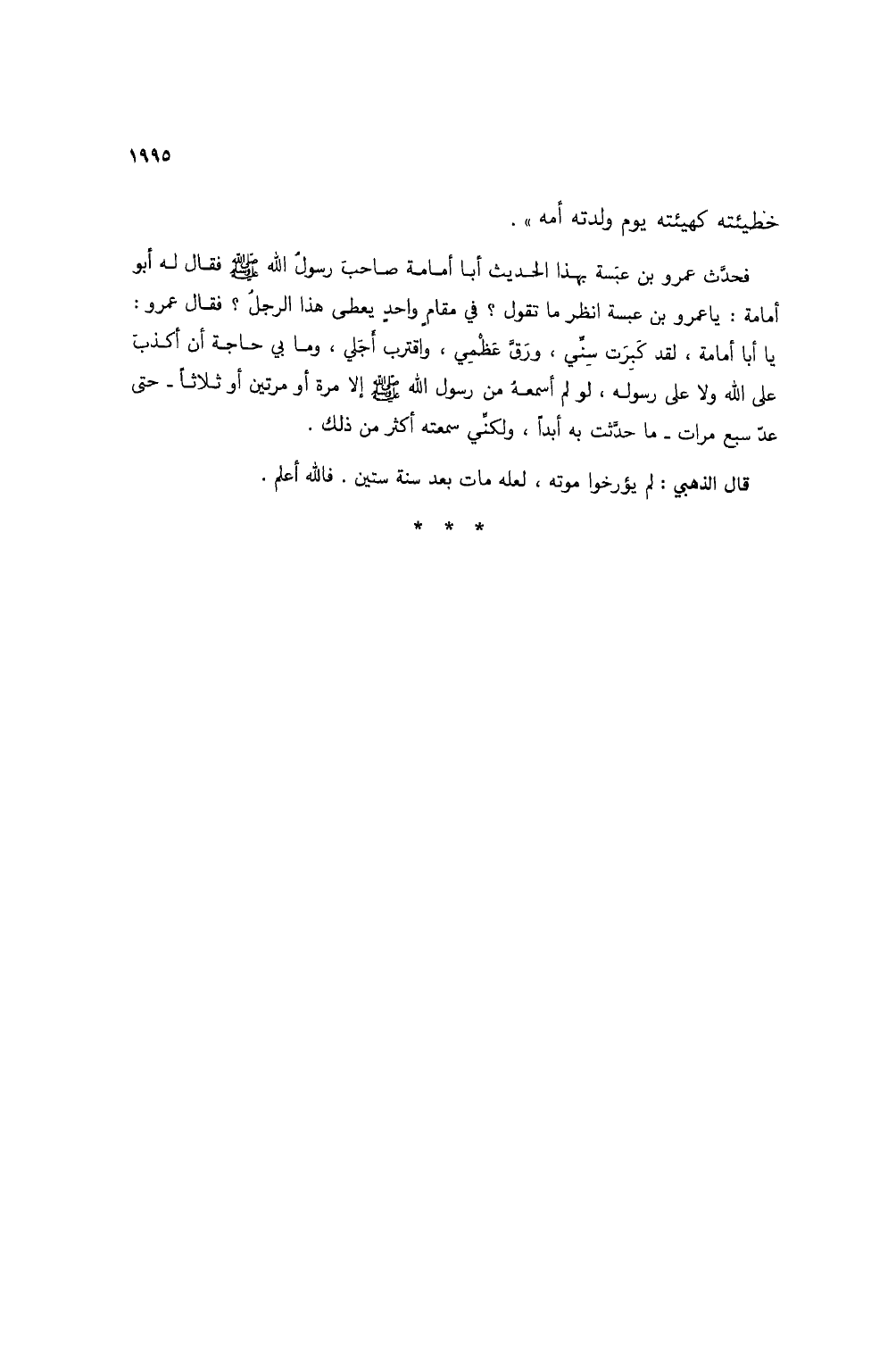 فحدث عمرو بت عبسة بهذا الحديث أبا أمامة صاحب رسول الله صلى الله عليه وسلم فقال له أبو أمامة: يا عمرو بن عبسة انظر ما تقول. في مقام واحد يعطى هذا الرجل؟ فقال عمرو: يا أبا إمامة، لقد كبرت سني، ورق عظمي، واقترب أجلي، وما بي حاجة أن أكذب على الله ولا على رسوله، لو لم أسمعه من رسول الله صلى الله عليه وسلم إلا مرة أو مرتين أو ثلاثاً - حتى عد سبع مرات - ما حدثت به أبداً، ولكني سمعته أكثر من ذلك.