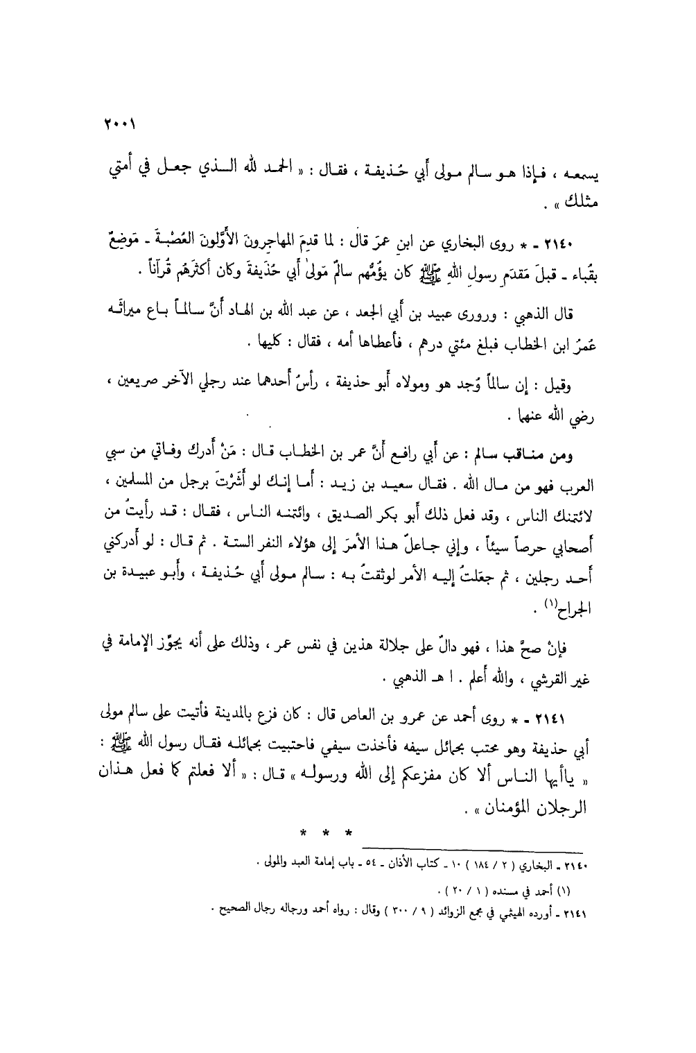 2140 - * روى البخاري عن ابن عمر قال: لما قدم المهاجرون الأولون العصبة - موضع بقباء - قبل مقدم رسول الله صلى الله عليه وسلم كان يؤمهم سالم مولى أبي حذيفة وكان أكثرهم قراناً.