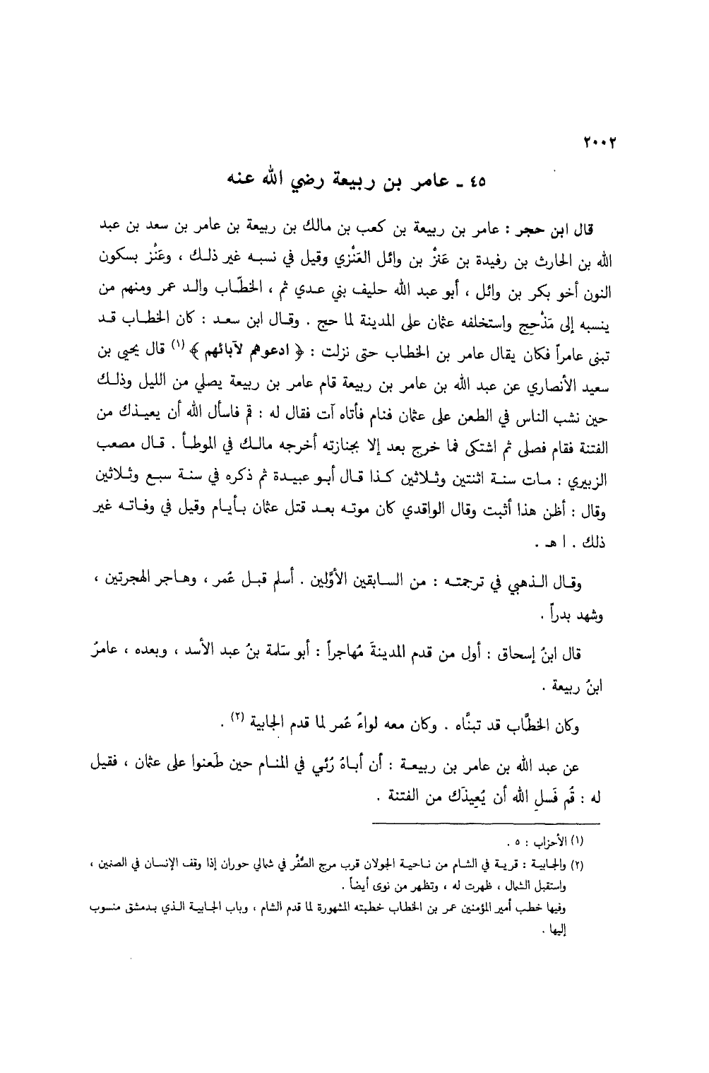 قال ابن حجر: عامر بن ربيعة بن كعب بن مالك بن ربيعة بن عامر بن سعد بن عبد الله بن الحارث بن رفيدة بن عنز بن وائل العنزي وقيل في نسبه غير ذلك، وعنز بسكون النون أخو بكر بن وائل، أبو عبد الله حليف بني عدي ثم، الخطاب والد عمر ومنهم من ينسبه إلى مذحج وأستخلفه عثمان على المدينة لما حج. وقال ابن سعد: كان الخطاب قد تبنى عامراً فكان يقال عامر بن الخطاب حتى نزلت: {ادْعُوهُمْ لِآبَائِهِمْ} (1) قال يحيى بن سعيد الأنصاري عن عبد الله بن عامر بن ربيعة قام عامر بن ربيعة يصلي من الليل وذلك حين نشب الناس في الطعن فنام فأتاه آت فقال له: قم فاسأل الله أن يعيذك من الفتنة فقام فصلى ثم اشتكى فما خرج بعد إلا بجنازته أخرجه مالك في الموطأ. قال مصعب الزبيري: مات سنة اثنتين وثلاثين كذا قال أبو عبيدة ثم ذكره في سنة سبع وثلاثين وقال: أظن هذا أثبت وقال الواقدي كان موته بعد قتل عثمان بأيام وقيل في وفاته غير ذلك. اهـ.
