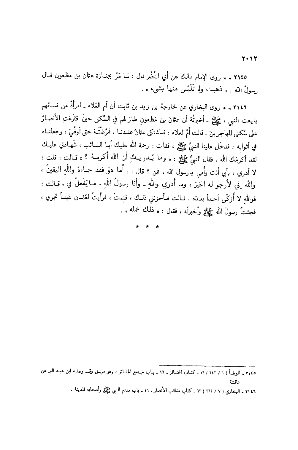 2145 - * روى الإمام مالك عن أبي النَّظْر قال: لما مُرَّ بجنازة عثمان بن مظعون قال رسولُ الله: "ذهبت ولم تلبس منها بشيء".