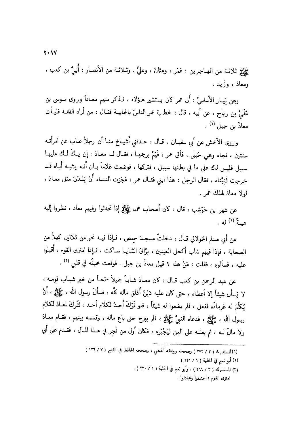 وعن نيار الأسلمي: أن عمر كان يستشير هؤلاء، فذكر منهم معاذاً وروى موسى بن عُلي بن رباح، عن أبيه، قال: خطب عمر الناس بالجابية فقال: من أراد الفقه فليأت معاذ بن جبل (1).
