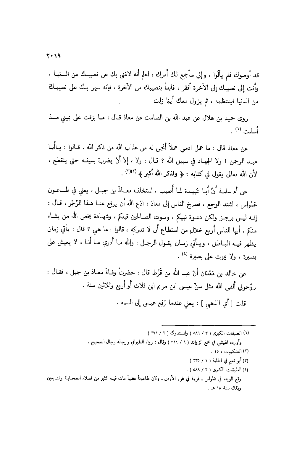 عن أم سلمة أنَّ أبا عُبيدة لما أُصيب، استخلف معاذ بن جبل، يعني في طاعون عمواس، اشتد الوجع، فصرخ الناس إلى معاذ: ادُع الله أن يرفع عنا هذا الرِّجْز، قال: إنه ليس برجز ولكن دعوة نبيكم، وموت الصالحين قبلكم، وشهادة يخص الله من يشاء منكم، أيها الناس أربع خلال من استطاع أن لا تدركه، قالوا: ما هي؟ قال: يأتي زمان يظهر فيه الباطل، ويأتي زمان يقول الرجل: والله ما أدري ما أنا، لا يعيش على بصيرة، ولا يموت على بصيرة (4).