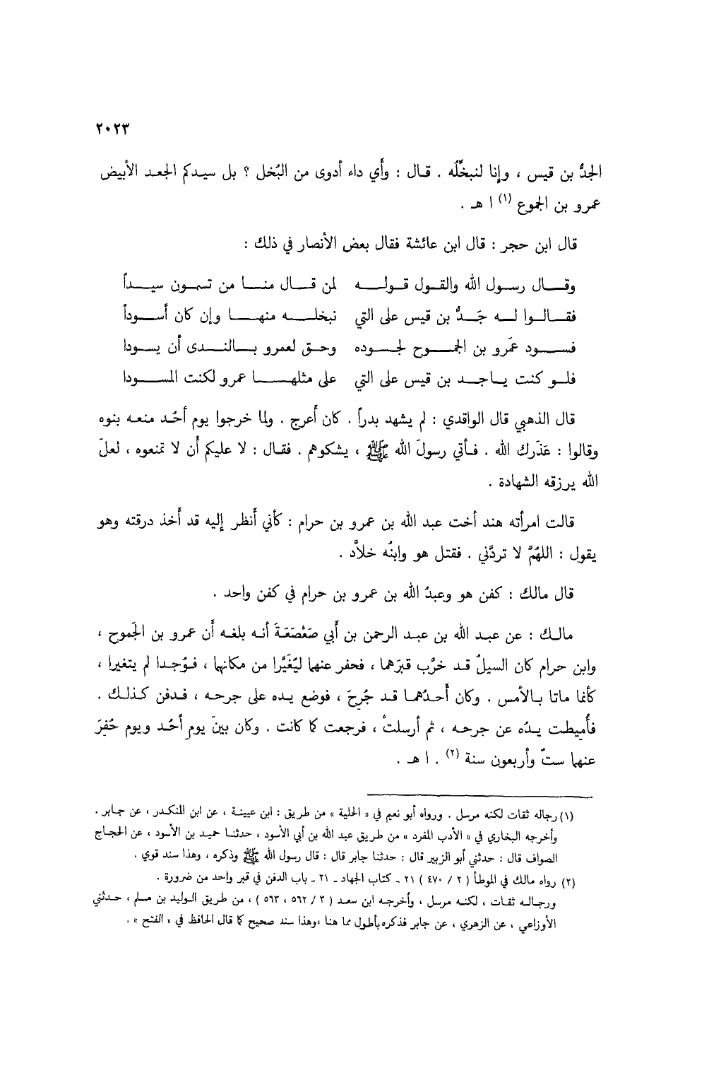 مالك: عن عبد الله بن عبد الرحمن بن أبي صعصعة أنه بلغه أن عمرو بن الجموح، وابن حرام كان السيل قد خرب قبرها، فحفر عنهما ليتغيرا من مكانها، فوُجدا لم يتغيرا، كأنما ماتا بالأمس. وكان أحدُهما قد جُرح، فوضع يده على جرحه، فدفن كذلك. فأُميطت يدُه عن جرحه، ثم أرسلت، فرجعت كما كانت. وكان بين يوم أحُد ويوم حُفر عنها ستٌ وأربعون سنة (2). اهـ.