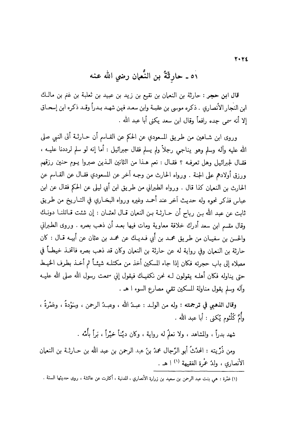 وروى ابن شاهين من طريق المسعودي عن الحكم عن القاسم أن حارثة أتى النبي صلى الله عليه وآله وسلم وهو يناجي رجلاً ولم يسلم فقال جبرائيل: إما إنه لو سلم لرددنا عليه، فقال لجبرائيل وهل تعرفه؟ فقال: نعم هذا من الثمانين الذين صبروا يوم حنين رزقهم ورزق أولادهم على الجنة. ورواه الحارث من وجه آخر عن المسعودي فقال عن القاسم عن الحارث بن النعمان كذا قال. ورواه الطبراني من طريق ابن أبي ليلى عن الحكم فقال عن ابن عباس فذكره نحوه وله حديث آخر عند أحمد وغيره ورواه البخاري في التاريخ من طريق ثابت عن عبد الله بن رباح أن حارثة بن النعمان قال لعثمان: إن شئت قاتلنا دونك وقال مقسم ابن سعد أدرك خلافه معاوية ومات فيها بعد أن ذهب بصره. وروى الطبراني والحسن بن سفيان من طريق محمد بن أبي فديك عن محمد بن عثمان عن أبيه قال: كان حارثة بن النعمان وفي رواية له عن حارثة بن النعمان وكان قد ذهب بصره فاتخذ خيطاً في مصلاه إلى باب حجرته فكان إذا جاء المسكين أخذ من مكتله شيئاً ثم أخذ بطرف الخيط حتى يناوله فكان أهله يقولون له نحن نكفيك فيقول إني سمعت رسول الله صلى الله عليه وآله وسلم يقول مناولة المسكين تقي مصارع السوء اهـ.