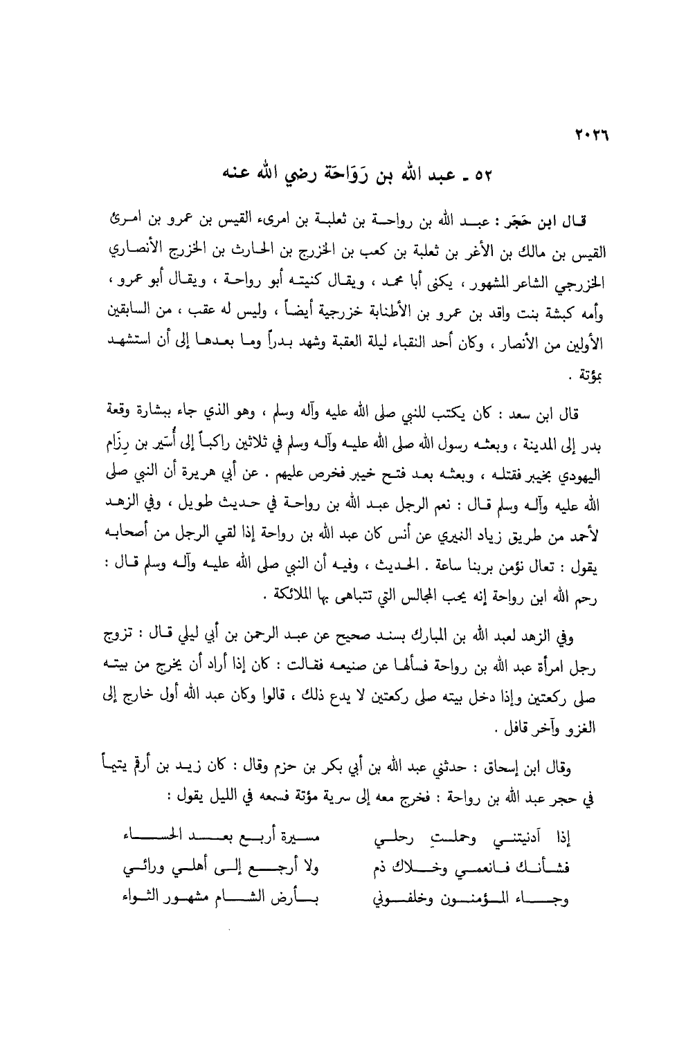 قال ابن حجر: عبد الله بن رواحة بن ثعلبة بن امرئ القيس بن عمرو بن امرئ القيس بن مالك بن الأغر بن ثعلبة بن كعب بن الخزرج بن الحارث بن الخزرج الأنصاري الخزرجي الشاعر المشهور، يكنى أبا محمد، ويقال كنيته أبو رواحة، ويقال أبو عمرو، وأمه كبشة بنت واقد بن عمرو بن الأطنابة خزرجية أيضاً، وليس له عقب، من السابقين الأولين من الأنصار، وكان أحد النقباء ليلة العقبة وشهد بدراً وما بعدها إلى أن استشهد بمؤتة.