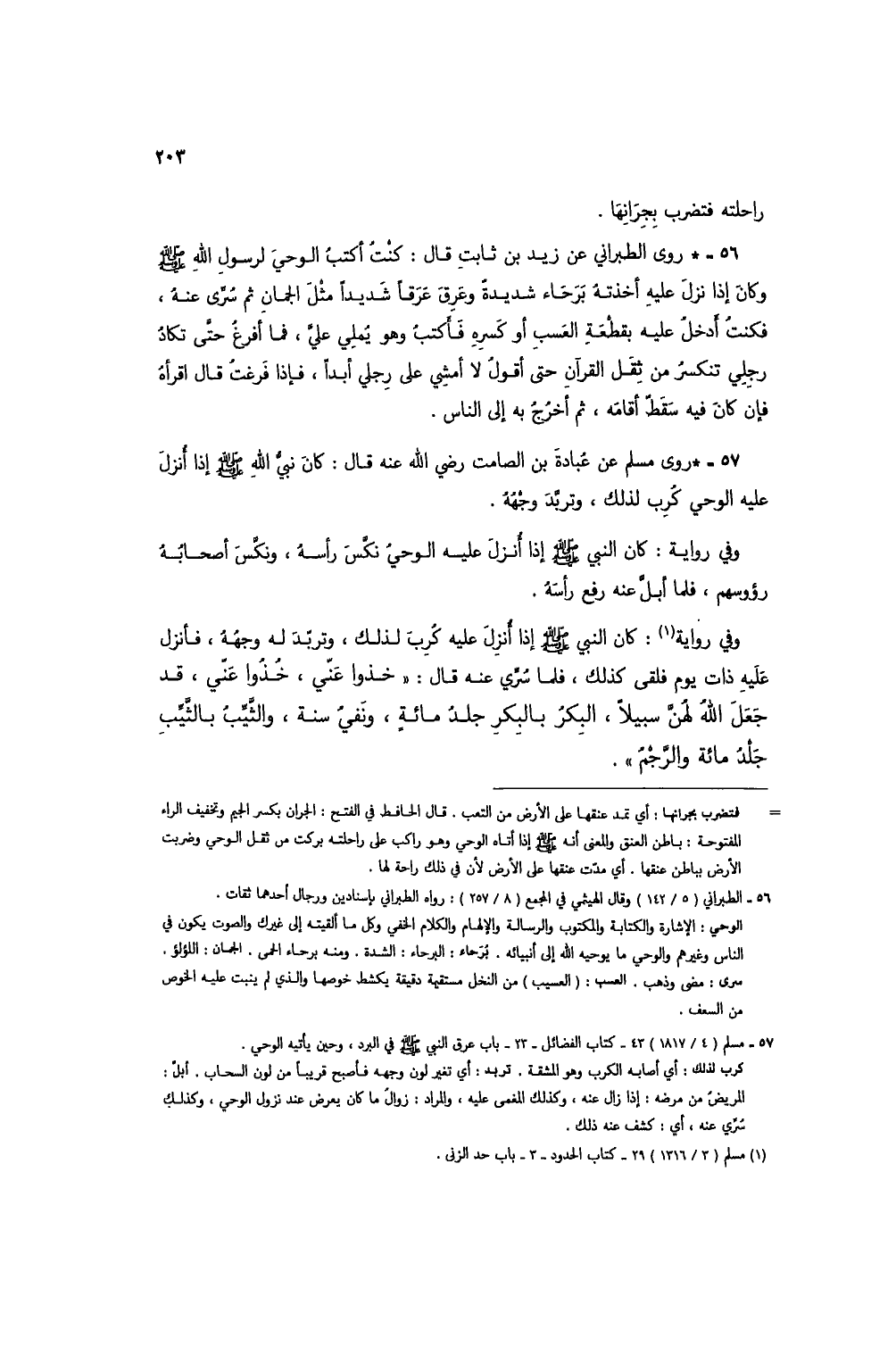 56 - * روى الطبراني عن زيد بن ثابت قال: كنُتُ أكتبُ الوحي لرسول الله صلى الله عليه وسلم وكان إذا نزل عليه أخذتهُ برحاء شديدةً وعرقَ عرقاً شديداً مثل الجانِ ثم سُرِّي عنهُ، فكنتُ ادخلُ عليه بقطعةِ العسبِ أو كسرهِ فأكتبُ وهو يملي عليَّ، فما أفرغُ حتى تكادُ رجلي تنكسرُ من ثقل القرآن حتى أقول لا أمشي على رجلي أبداً، فإذا فرغتُ قال اقرأهُ فإن كان فيه سقط أقامه، ثم أخرج به إلى الناس.