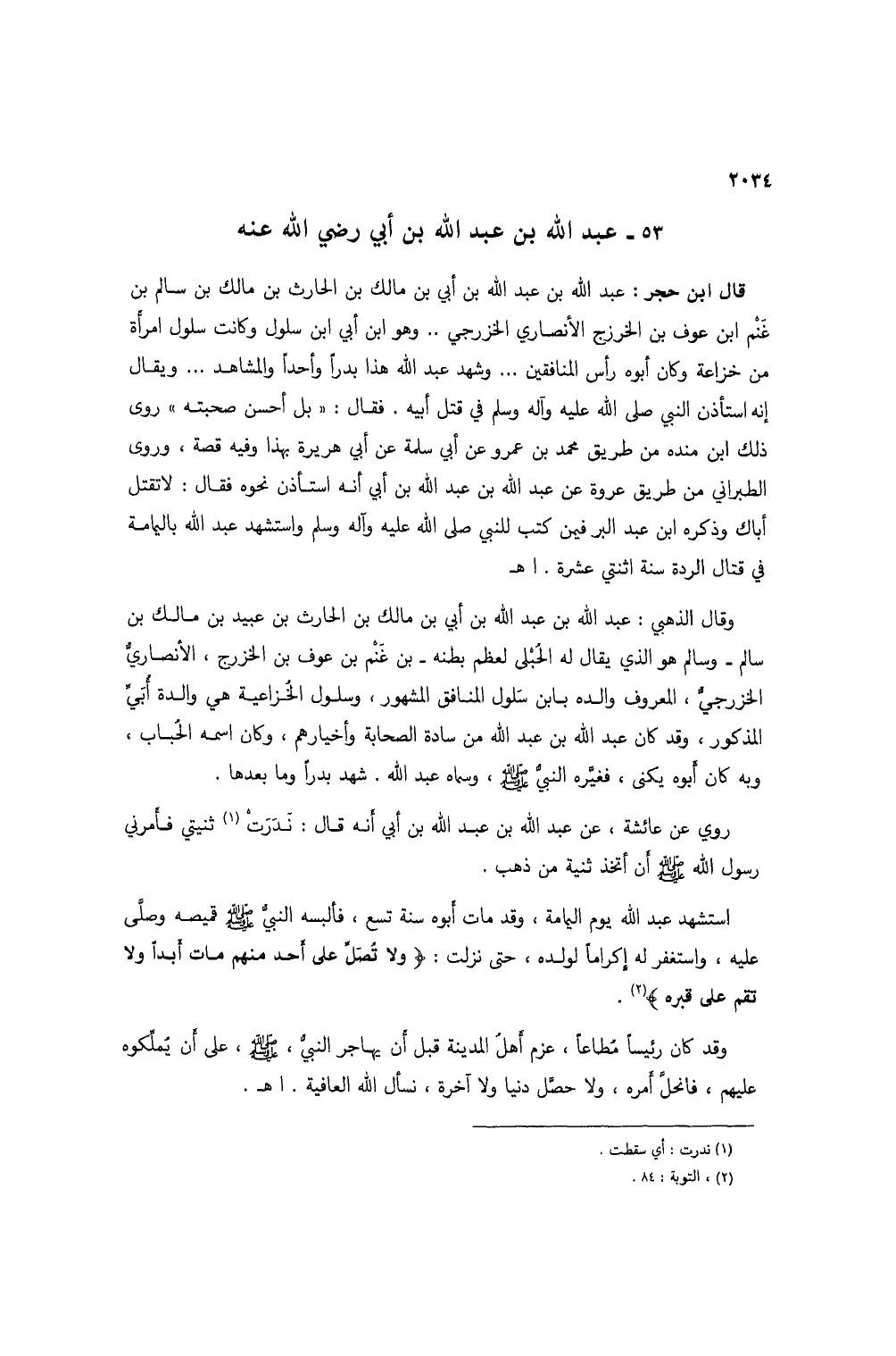 قال ابن حجر: عبد الله بن عبد الله بن أبي بن مالك بن الحارث بن مالك بن سالم بن غنم ابن عوف بن الخرزج الأنصاري الخزرجي ... وهو ابن أبي ابن سلول وكانت سلول امرأة من خزاعة وكان أبوه رأس المنافقين ... وشهد عبد الله هذا بدرًا وأحدًا والمشاهد ... ويقال إنه استأذن النبي صلى الله عليه وآله وسلم في قتل أبيه. فقال: "بل أحسن صحبته" روى ذلك ابن منده من طريق محمد بن عمرو عن أبي سلمة عن أبي هريرة بهذا وفيه قصة، وروى الطبراني من طريق عروة عن عبد الله بن عبد الله بن أبي أنه استأذن نحوه فقال: لا تقتل أباك وذكره ابن عبد البر فيمن كتب للنبي صلى الله عليه وآله وسلم واستشهد عبد الله باليمامة في قتال الردة سنة اثنتي عشرة. اهـ.