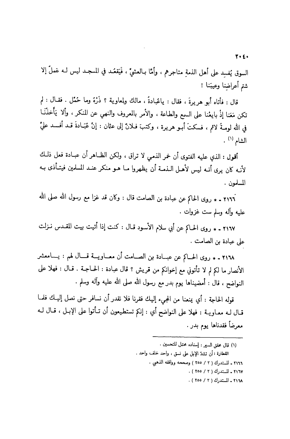 2168 - * روى الحاكم عن عبادة بن الصامت أن معاوية قال لهم: يا معشر الأنصار ما لكم لم لا تأتوني مع إخوانكم من قريش؟ قال عبادة: الحاجة. قال: فهلا على النواضح، قال: أمضيناها يوم بدر مع رسول الله صلى الله عليه وآله وسلم.