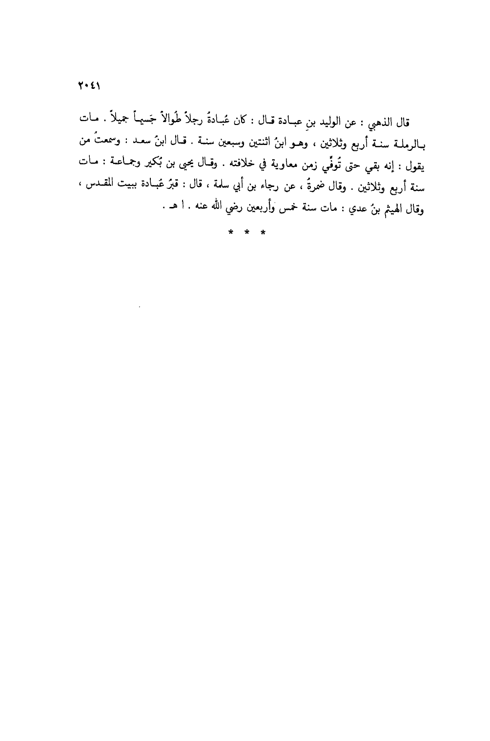 قال الذهبي: عن الوليد بن عبادة قال: كان عبادة رجلاً طوالاً جسيمًا جميلاً. مات بالرملة سنة أربع وثلاثين، وهو ابن اثنتين وسبعين سنة. قال ابن سعد: وسمعت من يقول: إنه بقي حتى توفي زمن معاوية في خلافته. وقال يحيى بن بكير وجاعة: مات سنة أربع وثلاثين. وقال ضمرة، عن رجاء بن أبي سلمة، قال: قبر عبادة ببيت المقدس، وقال الهيثم بن عدي: مات سنة خمس وأربعين رضي الله عنه. اهـ.