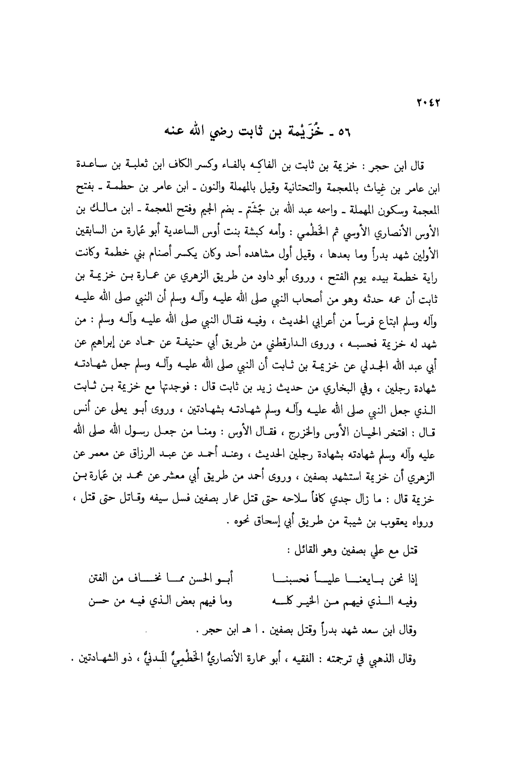 قال ابن حجر: خزيمة بن ثابت بن الفاكه بالفاء وكسر الكاف ابن ثعلبة بن ساعدة ابن عامر بن غياث بالمعجمة والتحتانية وقيل بالمهملة والنون -ابن عامر بن حطمة- بفتح المعجمة وسكون المهملة- واسمه عبد الله بن جشتم -بضم الجيم وفتح المعجمة- ابن مالك بن الأوس الأنصاري الأوسي ثم الخطمي: وأمه كبشة بنت أوس الساعدية أبو عمارة من السابقين الأولين شهد بدرًا وما بعدها، وقيل أول مشاهده أحد وكان يكسر أصنام بني خطمة وكانت راية خطمة بيده يوم الفتح، وروى أبو داود من طريق الزهري عن عمارة بن خزيمة بن ثابت أن عمه حدثه وهو من أصحاب النبي صلى الله عليه وآله وسلم أن النبي صلى الله عليه وآله وسلم ابتاع فرسًا من أعرابي الحديث، وفيه فقال النبي صلى الله عليه وآله وسلم: من شهد له خزيمة فحسبه، وروى الدارقطني من طريق أبي حنيفة عن حماد عن إبراهيم عن أبي عبد الله الجدلي عن خزيمة بن ثابت أن النبي صلى الله عليه وآله وسلم جعل شهادته شهادة رجلين، وفي البخاري من حديث زيد بن ثابت قال: فوجدتها مع خزيمة بن ثابت الذي جعل النبي صلى الله عليه وآله وسلم شهادته بشهادتين، وروى أبو يعلى عن أنس قال: افتخر الحيان الأوس والخزرج، فقال الأوس: ومنا من جعل رسول الله صلى الله عليه وآله وسلم شهادته بشهادة رجلين الحديث، وعند أحمد عن عبد الرزاق عن معمر عن الزهري أن خزيمة استشهد بصفين، وروى أحمد من طريق أبي معشر عن محمد بن عمارة بن خزيمة قال: ما زال جدي كافًا سلاحه حتى قتل عمار بصفين فسل سيفه وقاتل حتى قتل، ورواه يعقوب بن شيبة من طريق أبي إسحاق نحوه.