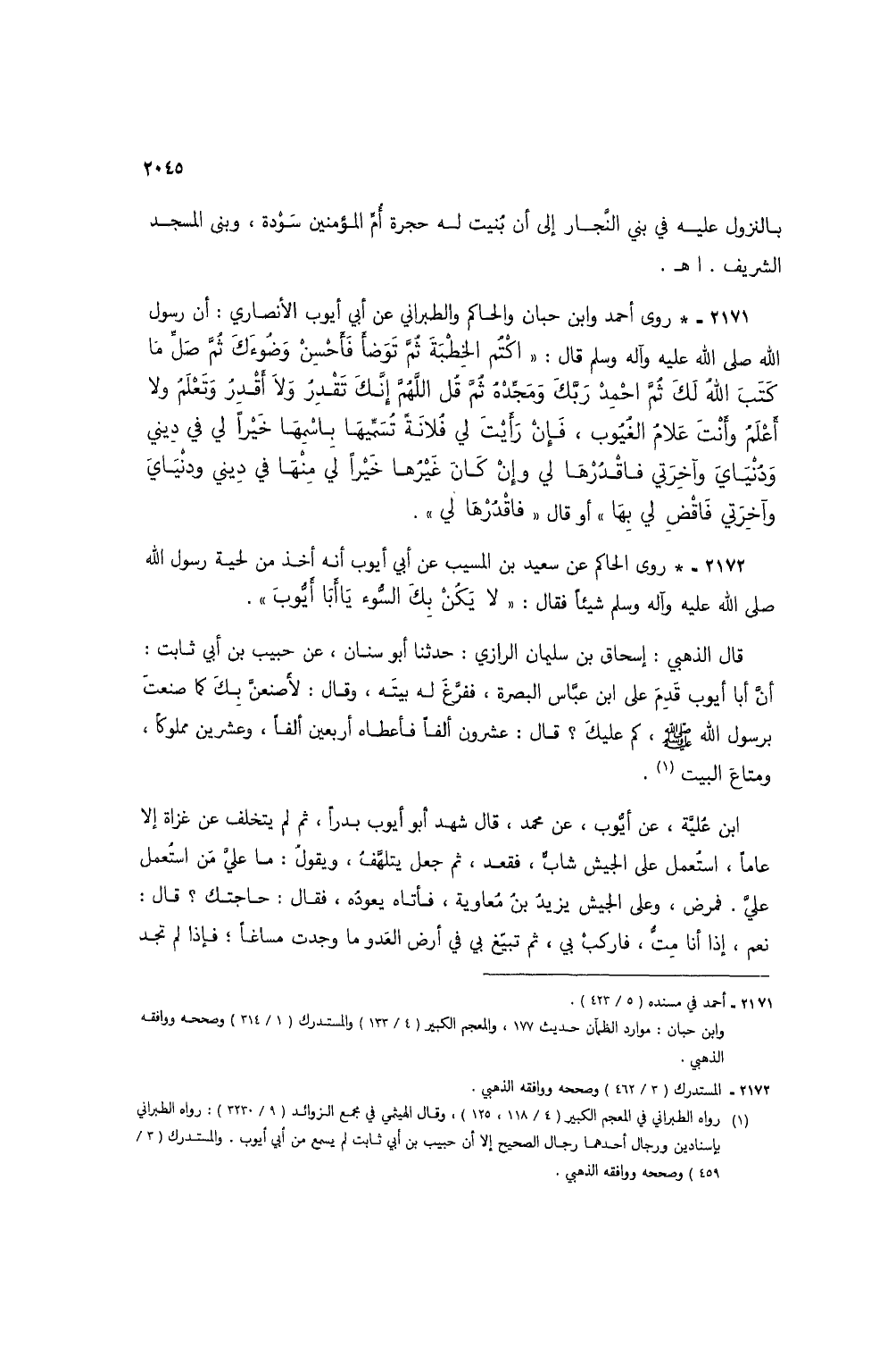 (1) رواه الطبراني في المعجم الكبير (4/ 118، 125)، وقال الهيثمي في مجمع الزوائد (9/ 3230): رواه الطبراني بإسنادين ورجال أحدهما رجال الصحيح إلا أن حبيب بن أبي ثابت لم يسمع من أبي أيوب. والمستدرك (2/ 459) وصححه ووافقه الذهبي.