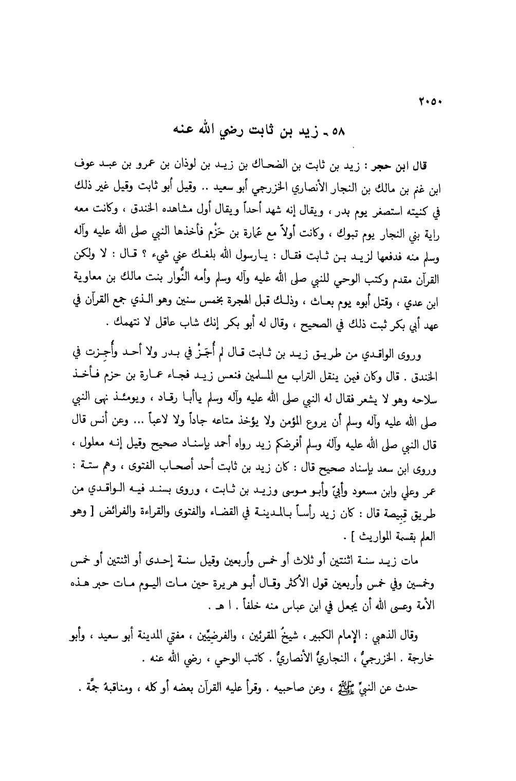 قال ابن حجر: زيد بن ثابت بن الضحاك بن زيد بن لوذان بن عمرو بن عبد عوف ابن غنم بن مالك بن النجار الأنصاري الخزرجي أبو سعيد .. وقيل أبو ثابت وقيل غير ذلك في كنيته استغصر يوم بدر، ويقال إنه شهد أحدًا ويقال أول مشاهده الخندق، وكانت معه راية بني النجار يوم تبوك، وكانت أولاً مع عمارة بن حزم فأخذها النبي صلى الله عليه وآله وسلم منه فدفعها لزيد بن ثابت فقال: يا رسول الله بلغك عني شيء؟ قال: لا ولكن القرآن مقدم وكتب الوحي للنبي صلى الله عليه وآله وسلم وأمه النوار بنت مالك بن معاوية ابن عدي، وقتل أبوه يوم بعاث، وذلك قبل الهجرة بخمس سنين وهو الذي جمع القرآن في عهد أبي بكر ثبت ذلك في الصحيح، وقال له أبو بكر إنك شاب عاقل لا نتهمك.