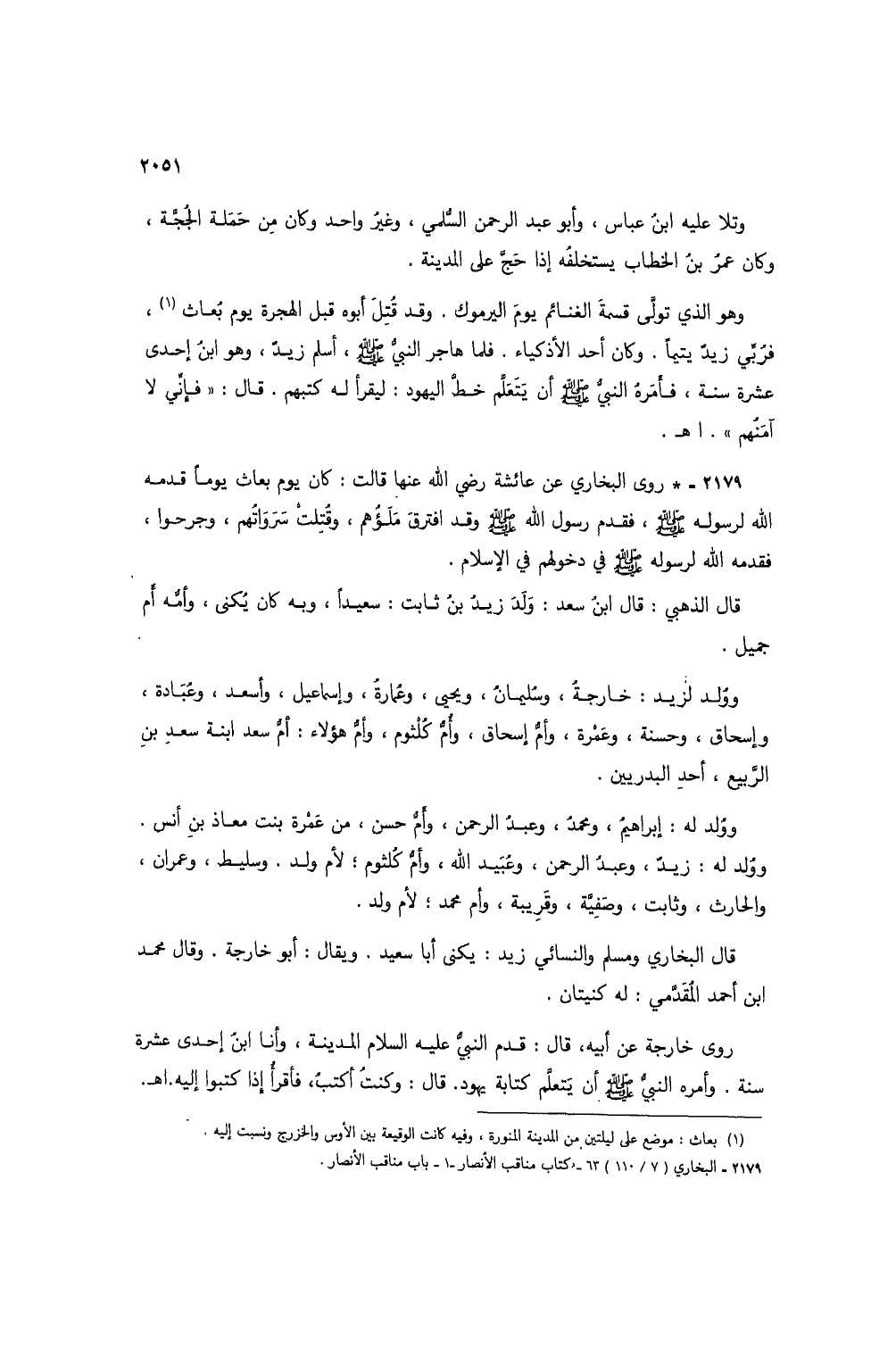 وهو الذي تولى قسمة قسمة الغنائم يوم اليرموك. وقد قتل أبوه قتل الهجرة يوم بعاث (1)، فربي زيد يتيمًا. وكان أحد الأذكياء. فلما هاجر النبي صلى الله عليه وسلم، أسلم زيد، وهو ابن إحدى عشرة سنة، فأمره النبي صلى الله عليه وسلم أن يتعلم خط اليهود: ليقرأ له كتبهم. قال: "فإني لا آمنهم". اهـ.