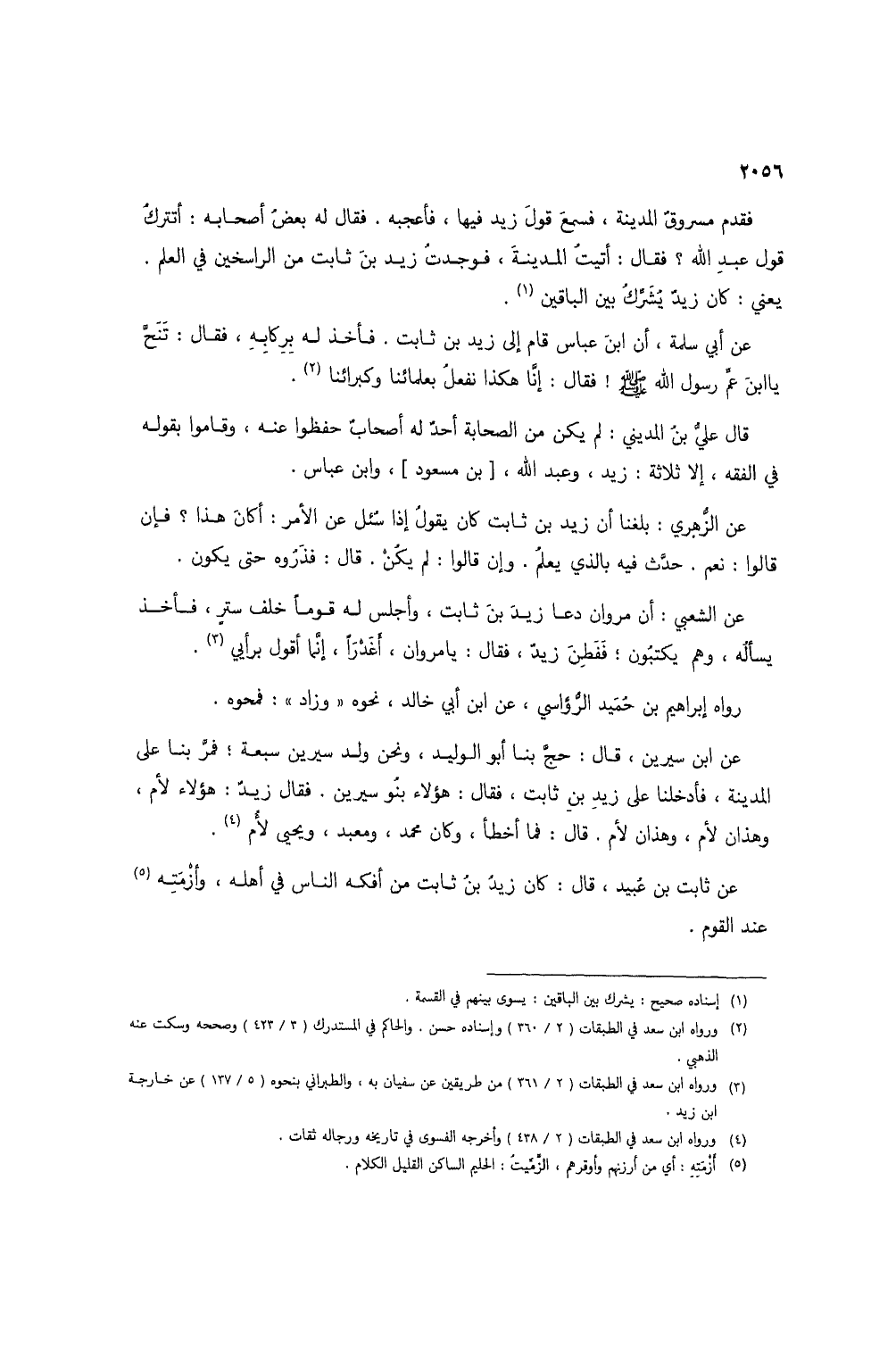 فقدم مسروق المدينة، فسمع قول زيد فيها، فأعجبه. فقال له بعض أصحابه: أتترك قول عبد الله؟ فقال: أتيت المدينة، فوجدت زيد بن ثابت من الراسخين في العلم. يعني: كان زيد يشرك بين الباقين (1).