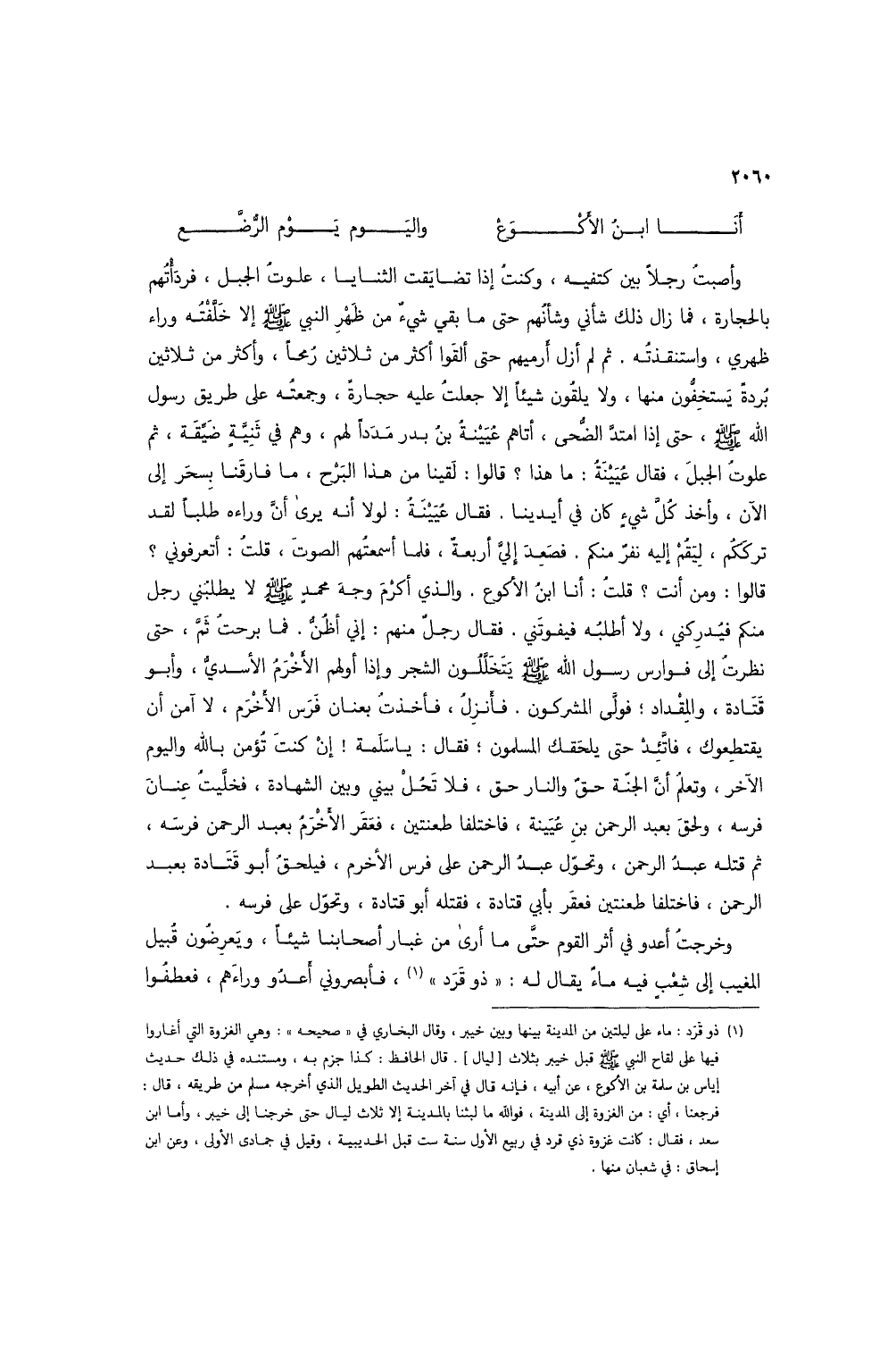 وأصبت رجالً بين كتفيه، وكنت إذا تضايقت الثنايا، علوت الجبل، فردأتهم بالحجارة، فما زال ذلك شأني وشأنهم حتى ما بقي من شيء من ظهر النبي صلى الله عليه وسلم إلا خلفته وراء ظهري، واستنقذته. ثم لم أزل أرميهم حتى ألقوا أكثر من ثلاثين رمحًا، وأكثر من ثلاثين بردة يستخفون منها، ولا يلقون شيئًا إلا جعلت عليه حجارة، وجمعته على طريق رسول الله صلى الله عليه وسلم، حتى إذا امتد الضحى، أتاهم عيينة بن بدر مددًا لهم، وهم في ثنيةٍ ضيقة، ثم علوت الجبل، فقال عيينة: ما هذا؟ قالوا: لقينا من هذا البرح، ما فارقنا بسحر إلى الآن، وأخذ كل شيءٍ كان في أيدينا. فقال عيينة: لولا أنه يرى أن وراءه طلبًا لقد ترككم، ليقم إليه نفر منكم. فصعد إلي أربعة، فلما أسمعتهم الصوت، قلت: أتعرفوني؟ قالوا: ومن أنت؟ قلت: أنا ابن الأكوع. والذي أكرم وجه محمدٍ صلى الله عليه وسلم لا يطلبني رجل منكم فيدركني، ولا أطلبه فيفوتني. فقال رجل منهم: إني أظن. فما برحت ثم، حتى نظرت إلى فوارس رسول الله صلى الله عليه وسلم يتخللون الشجر وإذا أولهم الأخرم الأسدي، وأبو قتادة، والمقداد؛ فولى المشركون. فأنزل، فأخذت بعنان فرس الأخرم، لا آمن أن يقتطعوك، فائتذ حتى يلحقك المسلمون؛ فقال: يا سلمة! إن كنت تؤمن بالله واليوم الآخر، وتعلم أن الجنة حق والنار حق، فلا تحل بيني وبين الشهادة، فخليت عنان فرسه، ولحق بعبد الرحمن بن عيينة، فاختلفا طعنتين، فعقر الأخرم بعبد الرحمن فرسه، ثم قتله عبد الرحمن، وتحول عبد الرحمن على فرس الأخرم، فيلحق أبو قتادة بعبد الرحمن، فاختلفا طعنتين فعقر بأبي قتادة، فقتله أبو قتادة، وتحول على فرسه.