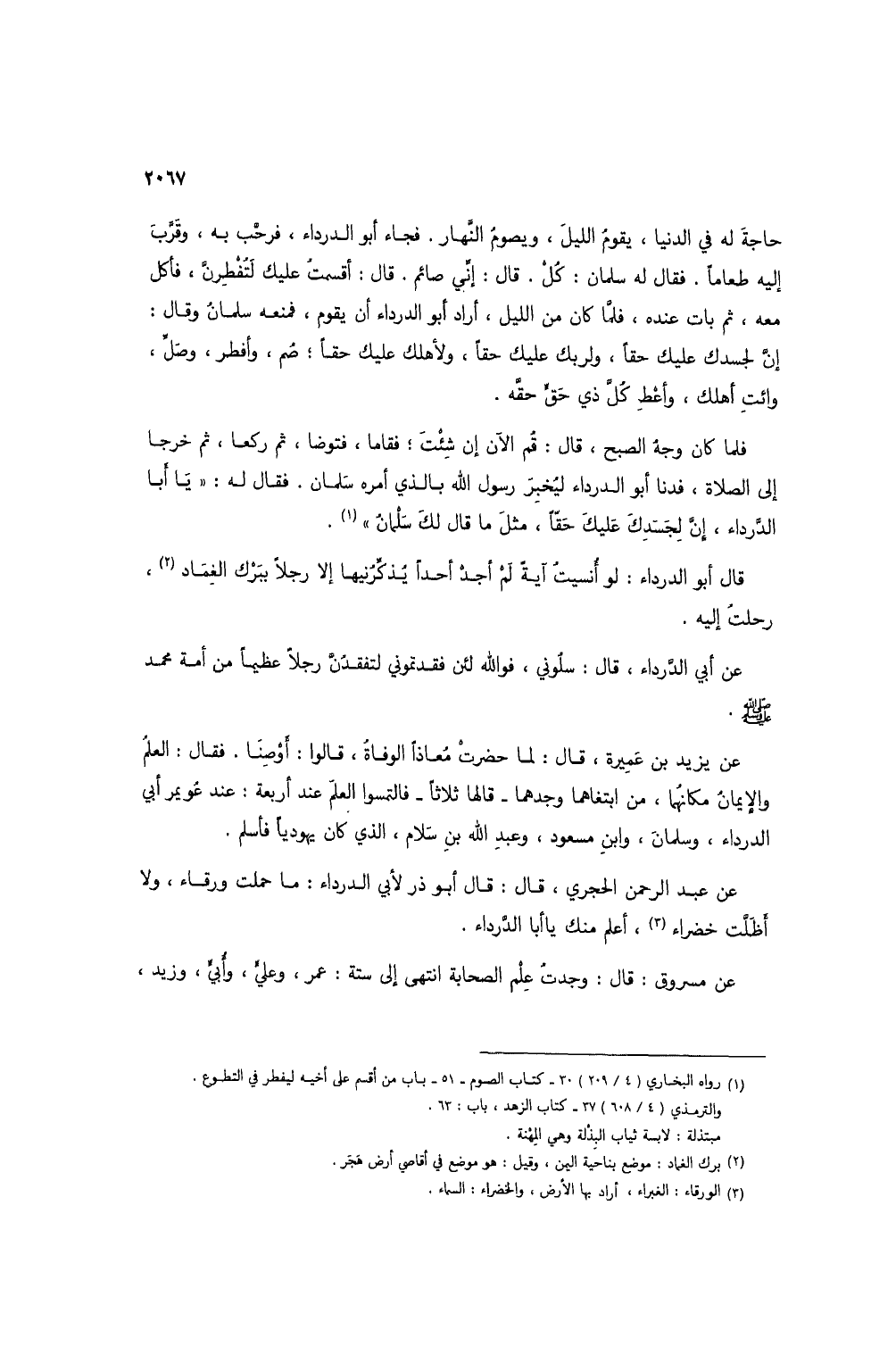 حاجة له الدنيا، يقوم الليل، ويصوم النهار. فجاء أبو الدرداء، فرحب به، وقرب إليه طعاماً. فقال له سلمان: كل. قال: إني ضائم. قال: أقسمت غليك لتفطرن، فأكل معه، ثم بات عنده، فلما كان من الليل، أراد أبو الدرداء أن يقوم، فمنعه سلمان وقال: إن لجسدك عليك حقاً، ولربك عليك حقاً، ولأهلك عليك حقاً؛ صم، وأفطر، وصل، وائت أهلك، وأعط كل ذي حق حقه.