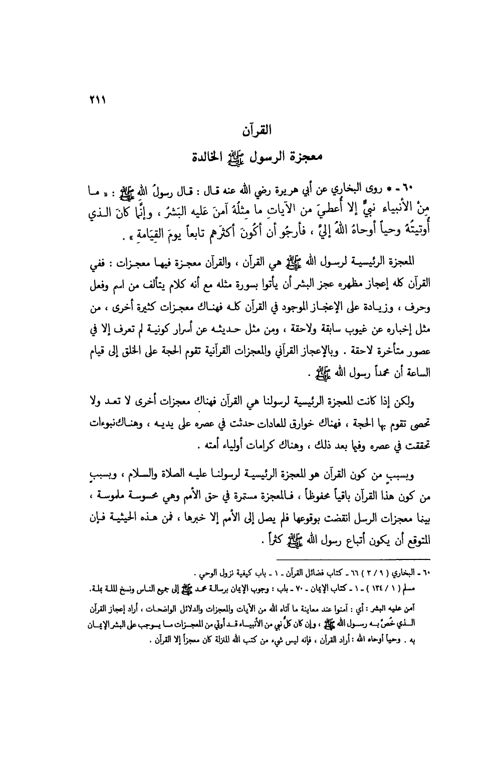 60 - * روى البخاري عن أبي هريرة رضي الله عنه قال: قال رسول الله صلى الله عليه وسلم: "ما من الأنبياء نبي إلا أعطي من الآيات ما مثلهُ آمن عليه البشرُ، وإنما كان الذي أوتيتهُ وحياً أوحاهُ الله إليَّ، فأرجو أن أكون أكثرهم تابعاً يوم القيامة".
