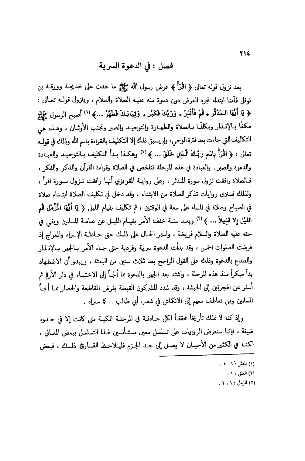 بعد نزول قوله تعالى {اقْرَأْ} عرض رسول الله صلى الله عليه وسلم ما حدث على خديجة وورقة بن نوفل فآمنا ابتداء لمجرد العرض دون دعوة منه عليه الصلاة والسلام، وبنزول قوله تعالى: {يَاأَيُّهَا الْمُدَّثِّرُ * قُمْ فَأَنْذِرْ * وَرَبَّكَ فَكَبِّرْ * وَثِيَابَكَ فَطَهِّرْ ....} (1) أصبح الرسول صلى الله عليه وسلم مكلفاً بالإنذار ومكلفاً بالصلاة والطهارة والتوحيد والصبر وتجنب الأوثان، وهي هي التكاليف التي جاءت بعد فترة الوحي، ولم يسبق ذلك إلا التكليف بالقراءة باسم الله وذلك في قوله تعالى: {اقْرَأْ بِاسْمِ رَبِّكَ الَّذِي خَلَقَ ...} (2) وهكذا بدأ التكليف بالتوحيد والعبادة والدعوة والصبر. والعبادة في هذه المرحلة تتلخص في الصلاة وقراءة القرآن والذكر والفكر، فالصلاة رافقت نزول سورة المدثر، وعلى رواية المقريزي أنها رافقت نزول سورة اقرأ، ولذلك فسنرى روايات تذكر الصلاة من الابتداء، وقد دخل في تكليف الصلاة ابتداء صلاة في الصباح وصلاة في المساء على سعة في الوقتين، ثم تكليف بقيام الليل {يَاأَيُّهَا الْمُزَّمِّلُ * قُمِ اللَّيْلَ إِلَّا قَلِيلًا ...} (3) وبعد سنة خفف الأمر بقيام الليل عن عامة المسلمين وبقي في حقه عليه الصلاة والسلام فريضة، واستمر الحال على ذلك حتى حادثة الإسراء والمعراج إذ فرضت الصلوات الخمس، وقد بدأت الدعوة سرية وفردية حتى جاء الأمر بالجهر بالإنذار والصدع بالدعوة وذلك على القول الراجح بعد ثلاث سنين من البعثة، ويبدو أن الاضطهاد بدأ مبكراً منذ هذه المرحلة، واشتد بعد الجهر بالدعوة مما ألجأ إلى الاختباء في دار الأرقم ثم أسفر عن الهجرتين إلى الحبشة، وقد شدد المشركون القبضة بفرض المقاطعة والحصار مما ألجأ المسلمين ومن تعاطف معهم إلى الانكماش في شعب أبي طالب ... كما سنراه.