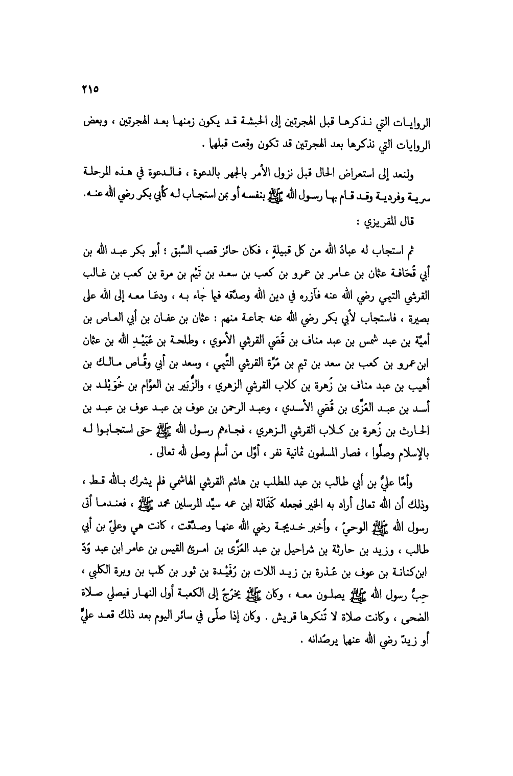 وأما عليُّ بن أبي طالب بن عبد المطلب بن هاشم القرشي الهاشمي فلم يشرك بالله قط، وذلك أن الله تعالى أراد به الخير فجعله كفالة ابن عمه سيد المرسلين محمد صلى الله عليه وسلم، فعندما أتى رسول الله صلى الله عليه وسلم الوحي، وأخبر خديجة رضي الله عنها وصدقت، كانت هي وعلي بن أبي طالبن وزيد بن حارثة بن شراحيل بن عبد العُزى بن امرئ القيس بن عامر ابن عبد وُد ابن كنانة بن عوف بن عُذرة بن زيد اللات بن رُفيدة بن ثور بن كلب بن وبرة الكلبي، حِبُّ رسول الله صلى الله لعيه وسلم يصلون معه، وكان صلى الله عليه وسلم يخرج إلى الكعبة أول النهار فيصلي صلاة الضحى، وكانت صلاة لا تنكرها قريش. وكان إذا صلى في سائر اليوم بعد ذلك قعد عليٌّ أو زيدٌ رضي الله عنهما يرصُدانه.
