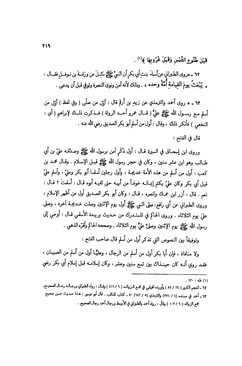 63 - * روى أحمد والترمذي عن زيدٍ بن أرقم قال: أول من صلى (وفي لفظ) أول من أسلم مع رسول الله صلى الله عليه وسلم عليٍّ (قال عمرو أحد الرواة) فذكرت ذلك لإبراهيم (أي: النخعي) فأنكر ذلك، وقال: أول من أسلم أبو بكر الصديق رضي الله عنه.