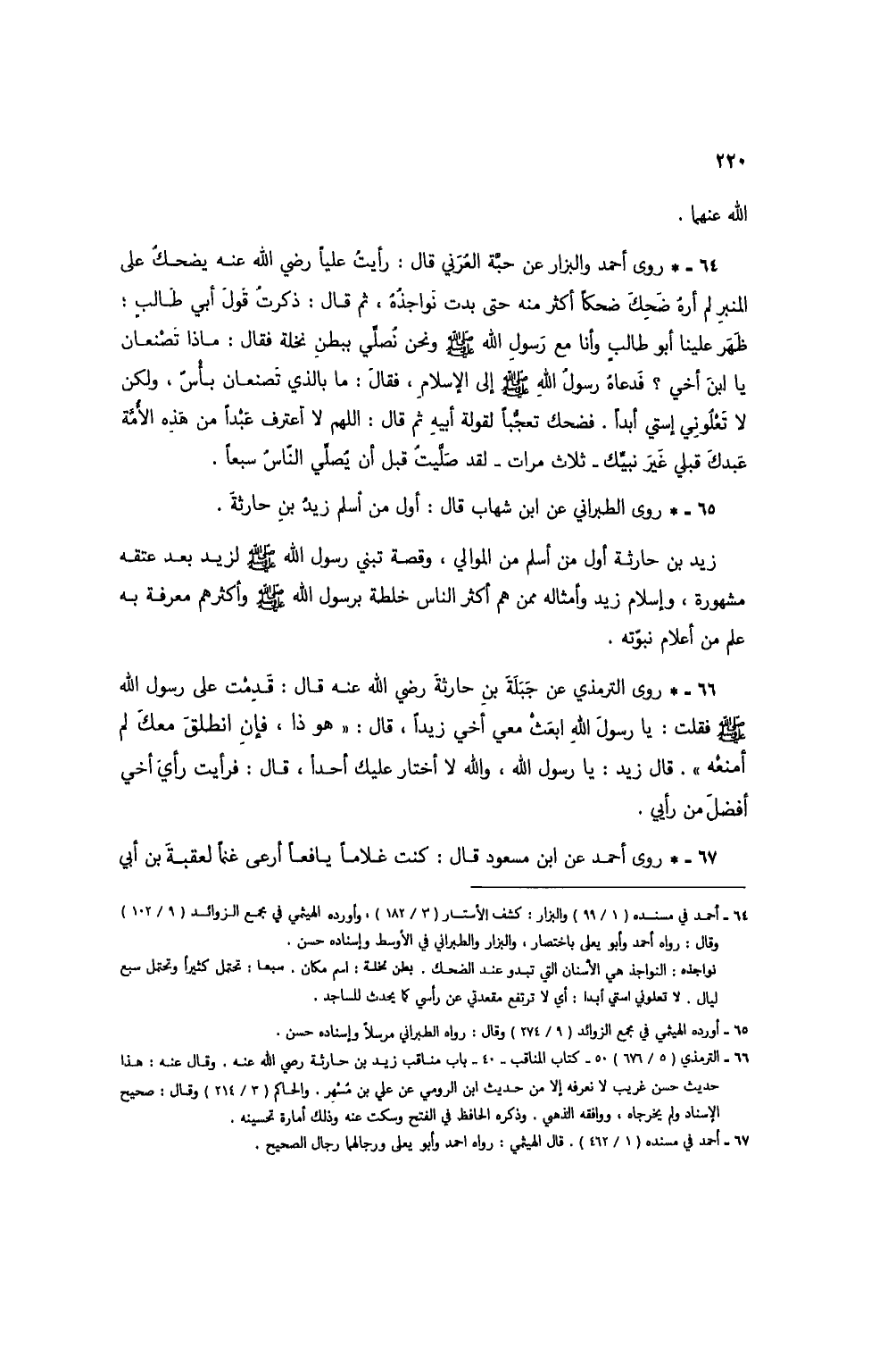 64 - * روى أحمد والبزار عن حبَّة العُرني قال: رأيتُ علياً رضي الله عنه يضحكُ على المنبر لم أرهُ ضحِكَ ضحكاً أكثر منه حتى بدت نواجذُهُ، ثم قال: ذكرتُ قول أبي طالب: ظهر علينا أبو طالب وأنا مع رسول الله صلى الله عليه وسلم ونحن نُصلي ببطن نخلة فقال: ماذا تصنعان يا ابن أخي؟ فدعاه رسول الله صلى الله عليه وسلم إلى الإسلام، فقال: ما بالذي تصنعان بأس، ولكن لا تعلوني إستي أبداً. فضحك تعجباً لقولة أبيه ثم قال: اللهم لا أعترف عبداً من هذه الأمة عبدك قبلي غير نبيك - ثل ثمرات - لقد صليتُ قبل أن يصلي الناس سبعاً.