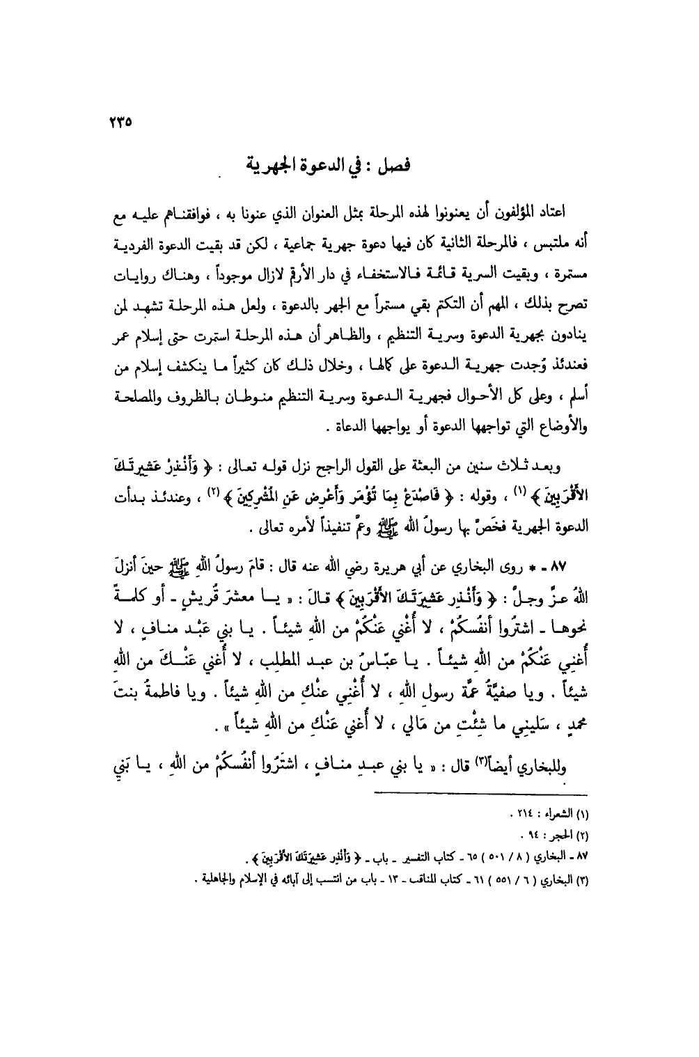 وبعد ثلاث سنين من البعثة على القول الراجح نزل قوله تعالى: {وَأَنْذِرْ عَشِيرَتَكَ الْأَقْرَبِينَ} (1)، وقوله: {فَاصْدَعْ بِمَا تُؤْمَرُ وَأَعْرِضْ عَنِ الْمُشْرِكِينَ} (2)، وعندئذ بدأت الدعوة الجهرية فخص بها رسول الله صلى الله عليه وسلم وعم تنفيذاً لأمره تعالى.