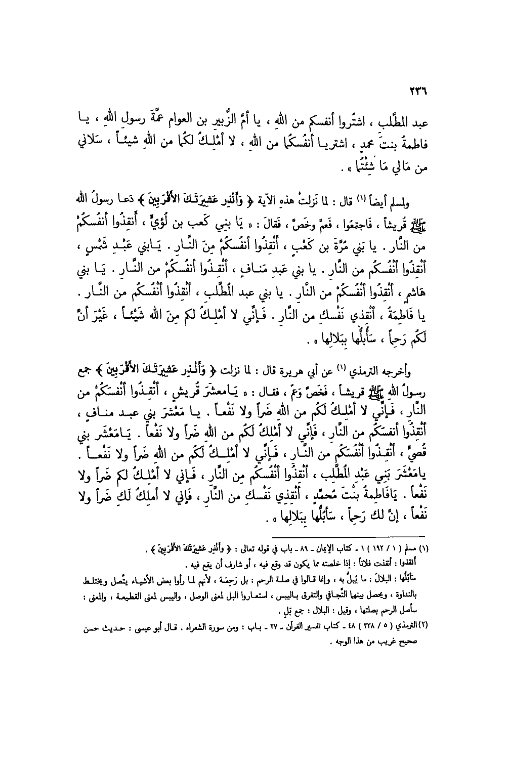 وأخرجه الترمذي (2) عن أبي هريرة قال: لما نزلت {وَأَنْذِرْ عَشِيرَتَكَ الْأَقْرَبِينَ} جمع رسول الله صلى الله عليه وسلم قريشاً، فخص وعم، فقال: "يا معشر قريشٍ، أنقذوا أنفسكم من النار، فإني لا أملك لكم من الله ضراً ولا نفعاً. يا معشر بني عبد منافٍ، أنقذوا أنفسكم من النار، فإني لا أملك لكم من الله ضراً ولا نفعاً. يا معشر بني قُصي، أنقذوا أنفسكم من النار، فإني لا أملك لكم من الله ضراً ولا نفعاً. يا معشر بني عبد المطلب، أنقذوا أنفسكم من النار، فإني لا أملكُ لكم ضراً ولا نفعاً. يا فاطمة بنت محمدٍ، أنقذي نفسك من النار، فإني لا أملك لك ضراً ولا نفعاً، إن لك رحماً، سأبُلُّها ببلالها".