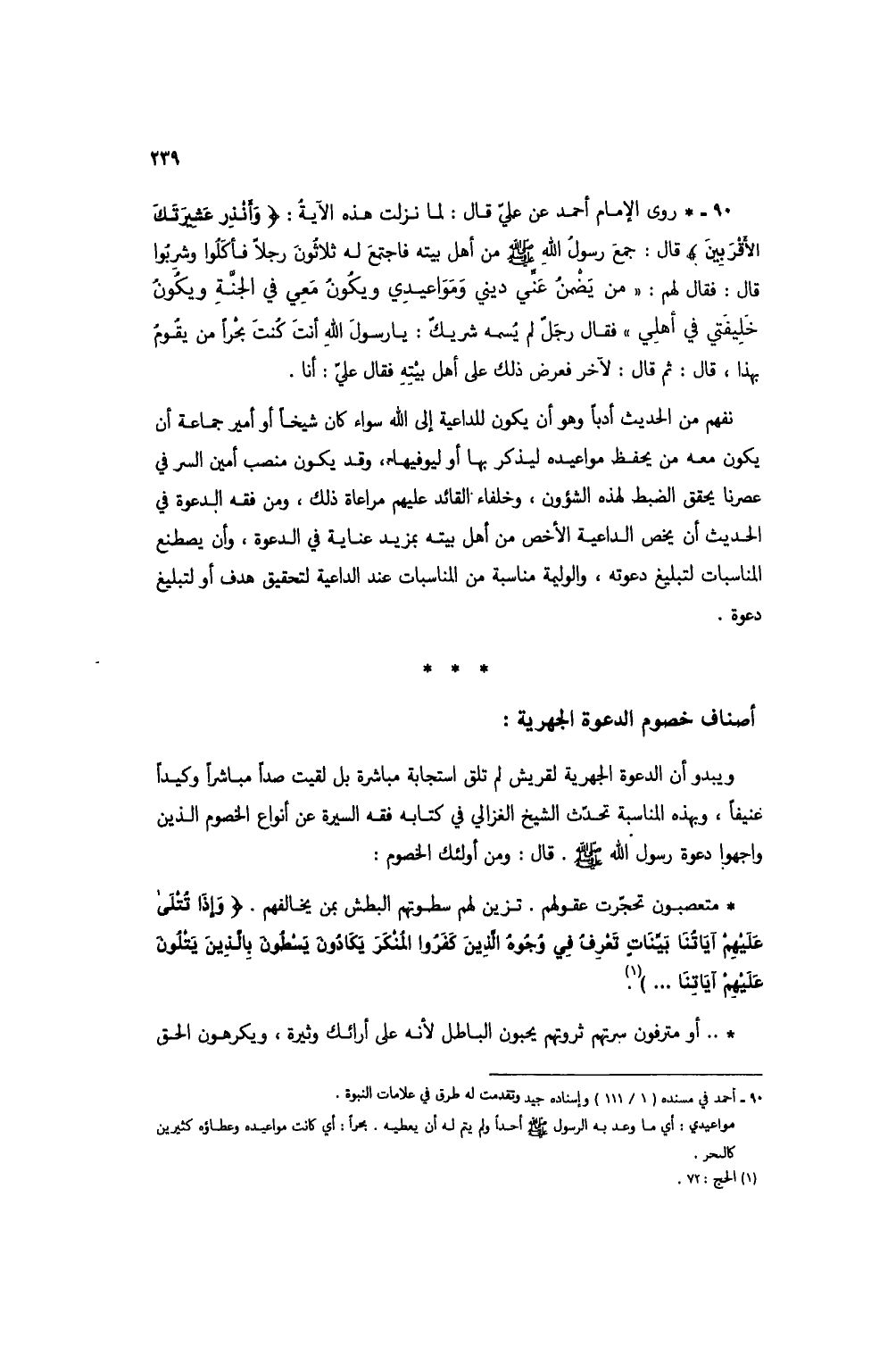 90 - * روى الإمام أحمد عن علي قال: لما نزلت هذه الآية: {وَأَنْذِرْ عَشِيرَتَكَ الْأَقْرَبِينَ} قال: جمع رسول الله صلى الله عليه وسلم من أهل بيته فاجتمع له ثلاثون رجلاً فأكلوا وشربوا قال: فقال لهم: "من يضمن عني ديني ومواعيدي ويكون معي في الجنة ويكون خليفتي في أهلي" فقال رجل لم يُسمه شريكٌ: يا رسول الله أنت كنت بحراً من يقوم بهذا، قال: ثم قال: لآخر فعرض ذلك على أهل بيته فقال علي: أنا.