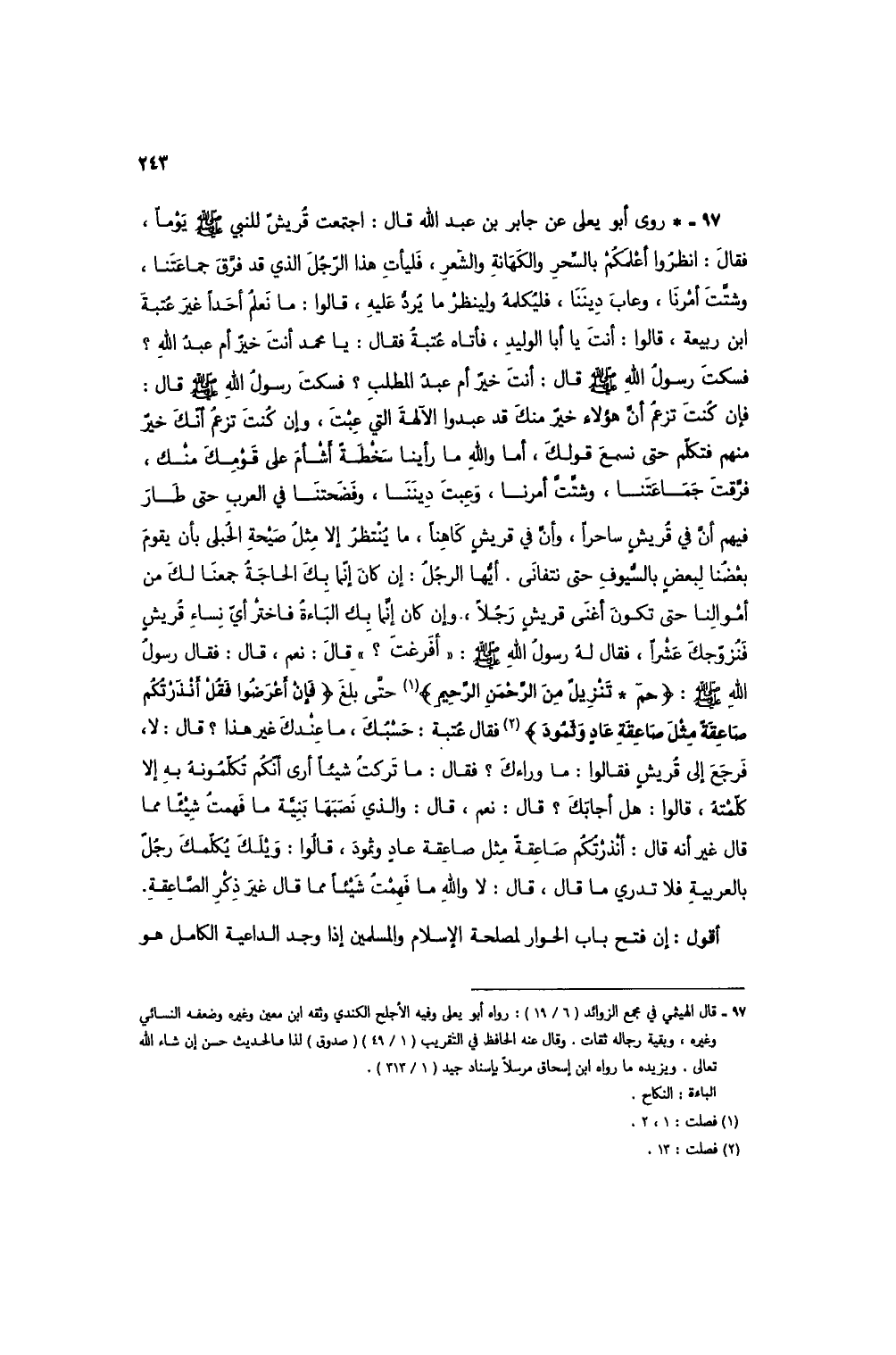 97 - * روى أبو يعلي عن جابر بن عبد الله قال: اجتمعت قريش للنبي صلى الله عليه وسلم يوماً، فقال: انظروا أعلمكم بالسحر والكهانة والشعر، فليأتِ هذا الرجل الذي قد فرق جماعتنا، وشتت أمرنا، وعاب ديننا، فليكلمه ولينظر ما يرد عليه، قالوا: ما نعلمُ أحداً غير عتبة ابن ربيعة، قالوا: أنت يا أبا الوليد، فأتاه عتبةُ فقال: يا محمد أنت خير أم عبد الله؟ فسكت رسول الله صلى الله عليه وسلم قال: أنت خيرٌ أم بعد المطلبِ؟ فسكت رسول الله صلى الله عليه وسلم قال: فإن كنت تزعم أن هؤلاء خيرٌ منك قد عبدوا الآلهة التي عبت، وإن كُنت تزعمُ أنك خيرٌ منهم فتكلم حتى نسمع قولك، أما والله ما رأينا سخطة أشأم على قومك منك، فرقت جماعتنا، وشتت أمرنا، وعبت ديننا، وفضحتنا في العرب حتى طار فيهم أن في قريش ساحراً، وأن في قريش كاهناً، ما يُنتظرُ إلا مثل صيحةِ الحبلى بأن يقوم بعضنا لبعض بالسيوف حتى تتفانى. أيها الرجل: إن كان إنما بك الحاجة جمعنا لك من أموالنا حتى تكون أغنى قريشٍ رجلاً، وإن كان إنما بك الباءة فاختر أي نساء قريش فنزوجك عشراً، فقال له رسول الله صلى الله عليه وسلم: "أفرغت؟ " قال: نعم، قال: فقال رسول الله صلى الله عليه وسلم: {حم * تَنْزِيلٌ مِنَ الرَّحْمَنِ الرَّحِيمِ} (1) حتى بلغ {فَإِنْ أَعْرَضُوا فَقُلْ أَنْذَرْتُكُمْ صَاعِقَةً مِثْلَ صَاعِقَةِ عَادٍ وَثَمُودَ} (2) فقال عتبة: حسبُك، ما عندك غير هذا؟ قال: لا، فرجع إلى قريش فقالوا: ما وراءك؟ فقال: ما تركتُ شيئاً أرى أنكم تكلمونهُ به إلا كلمته، قالوا: هل أجابك؟ قال: نعم، قال: والذي نصبها بنية ما فهمت شيئاً مما قال غير أنه قال: أنذرتكم صاعقة مثل صاعقة عاد وثمود، قالوا: ويلك يكلمك رجل بالعربية فلا تدري ما قال، قال: لا والله ما فهمت شيئاً مما قال غير ذكر الصاعقة.