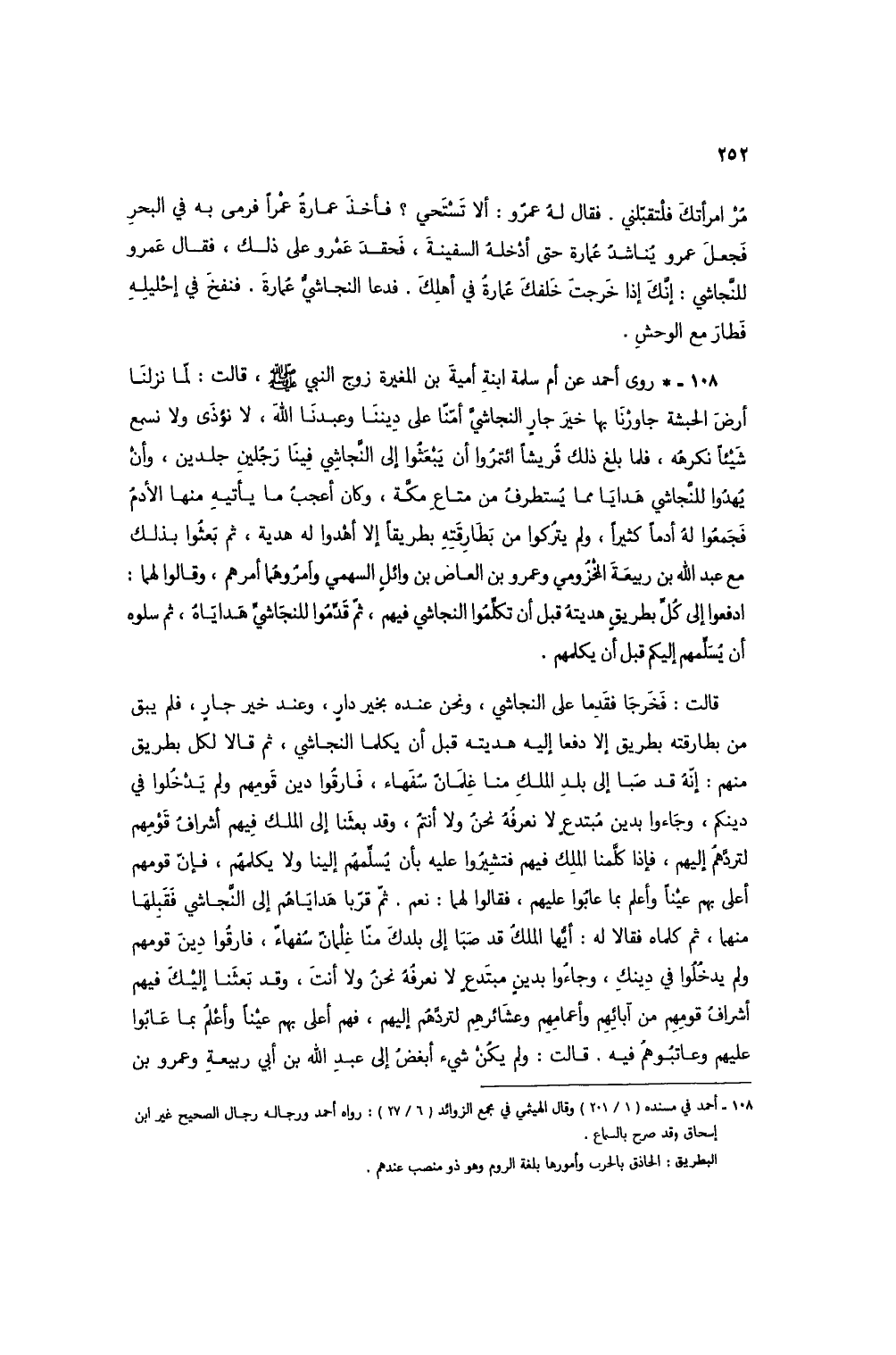 108 - * روى أحمد عن أم سلمة ابنة أمية بن المغيرة زوج النبي صلى الله عليه وسلم، قالت: لما نزلنا أرض الحبشة جاورنا بها خير جارٍ النجاشي أمنا على ديننا وعبدنا الله، لا نؤذي ولا نسمع شيئاً نكرهه، فلما بلغ ذلك قرشاً ائتمروا أن يبعثوا إلى النجاشي فينا رجلين جلدين، وأن يُهُدوا للنجاشي هدايا مما يُستطرف من متاع مكة، وكان أعجب ما يأتيه منها الأدم فجمعوا له أدماً كثيراً، ولم يتركوا من بطارقته بطريقاً إلا أهدوا له هدية، ثم بعثوا بذلك مع عبد الله بن ربيعة المخزومي وعمرو بن العاص بن وائل السهمي وأمروهما أمرهم، وقالوا لهما: ادفعوا إلى كل بطريق هديته قبل أن تكلموا النجاشي فيهم، ثم قدموا للنجاشي هداياه، ثم سلوه أن يسلمهم إليكم قبل أن يكلمهم.