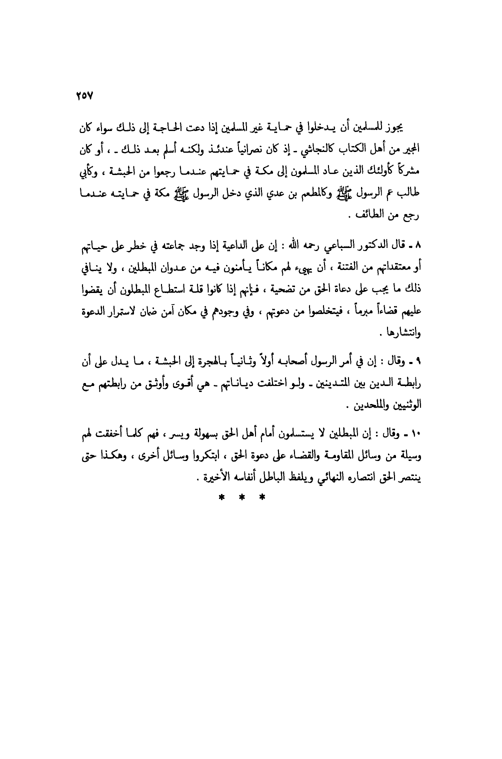 9 - وقال: إن في أمر الرسول أصحابه أولاً وثانياً بالهجرة إلى الحبشة، ما يدل على أن رابطة الدين بين المتدينين - ولو اختلفت دياناتهم - هي أقوى وأوثق من رابطتهم مع الوثنيين والملحدين.