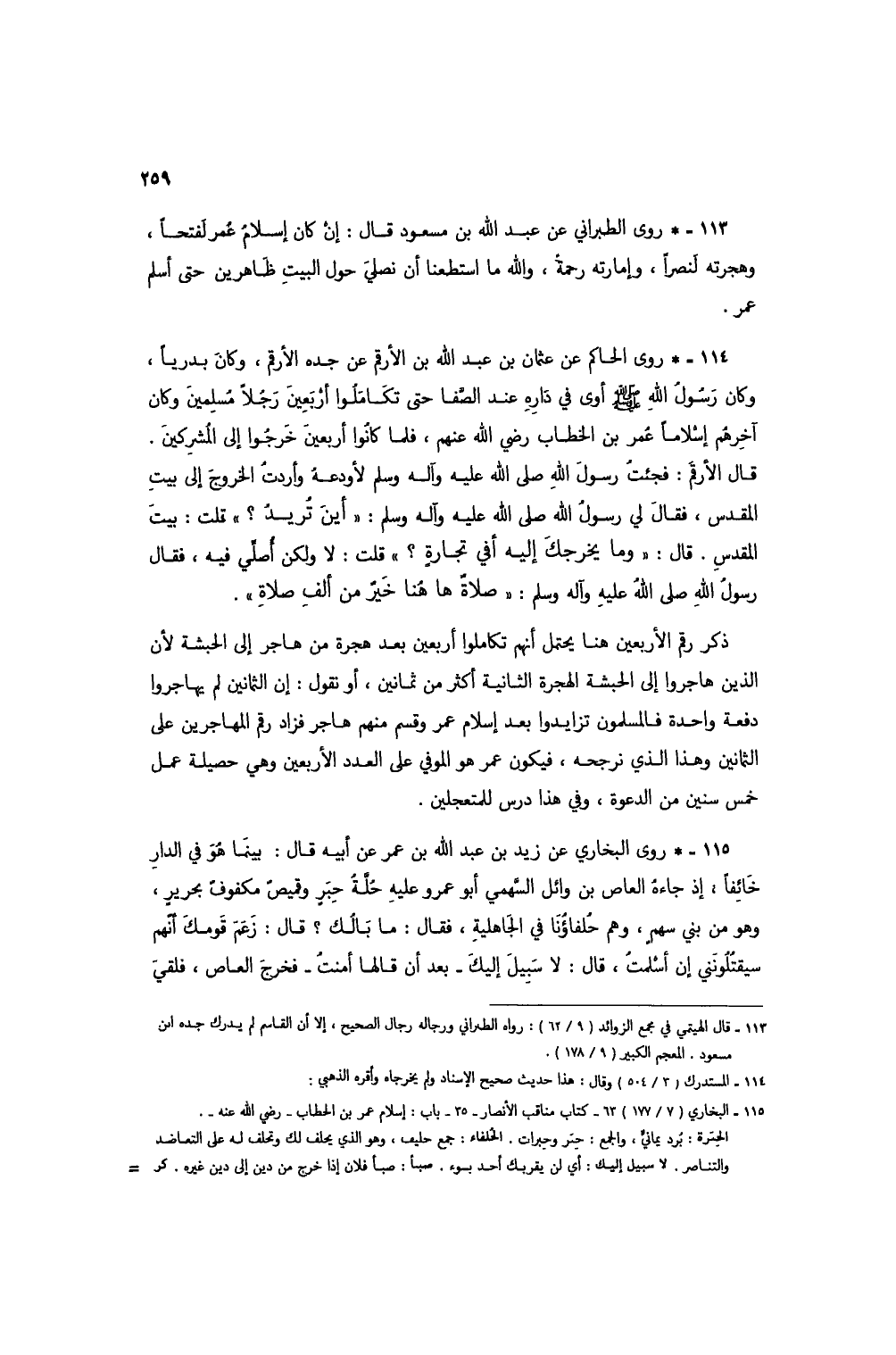 115 - * روى البخاري عن زيد بن عبد الله بن عمر عن أبيه قال: بينما هو في الدار خائفاً، إذ جاءه العاص بن وائل السهمي أبو عمرو عليه حُلةُ حبرٍ وقميصُ مكفوف بحرير، وهو من بني سهم، وهم حلفاؤنا في الجاهلية، فقال: ما بالك؟ قال: زعم قومك أنهم سيقتلونني إن أسلمتُ، قال: لا سبيل إليك - بعد أن قالها أمنتُ - فخرج العاص، فلقيَ