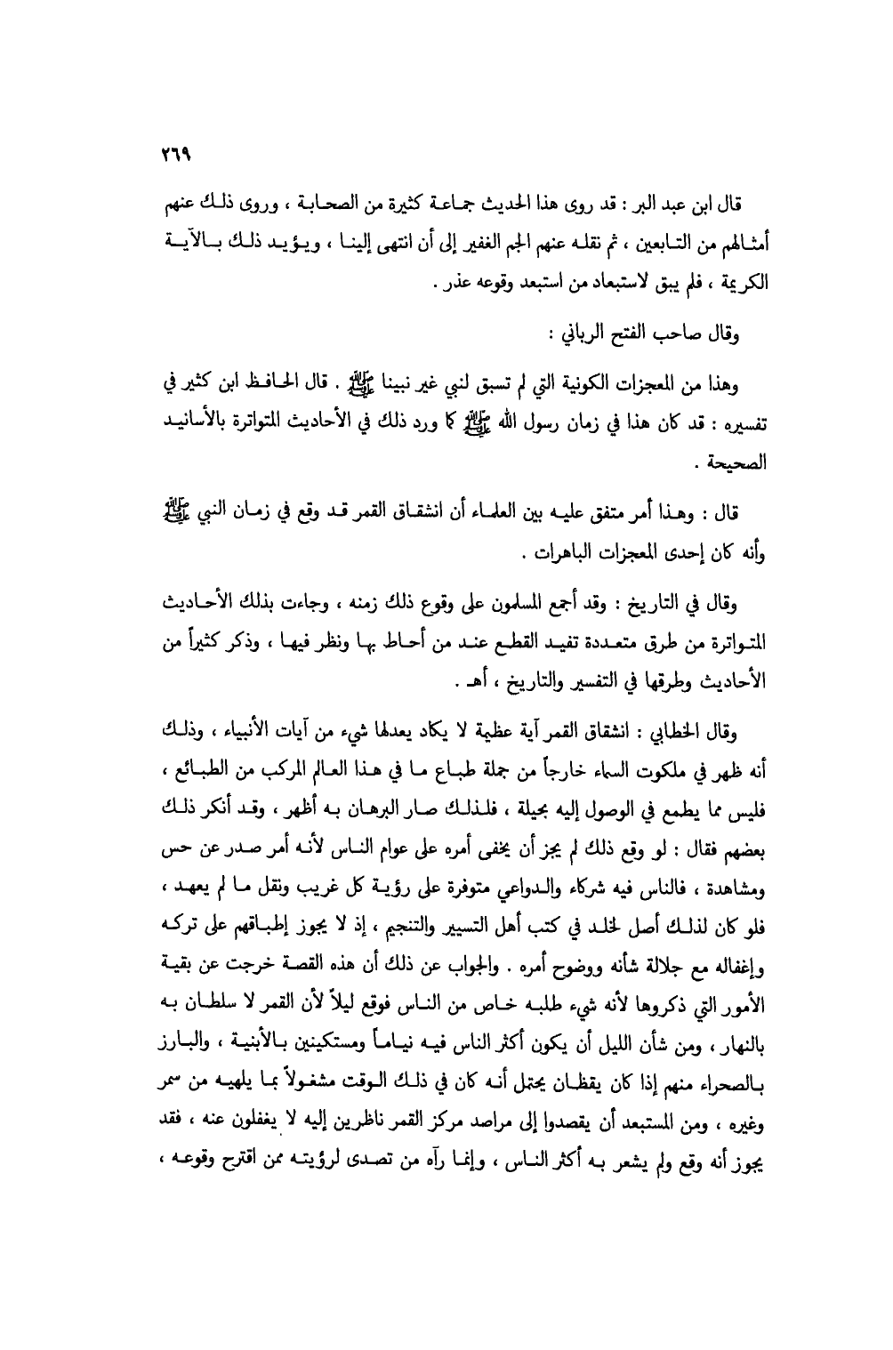 قال: وهذا أمر متفق عليه بين العلماء أن انشقاق القمر قد وقع في زمان النبي صلى الله عليه وسلم وأنه كان إحدى المعجزات الباهرات.