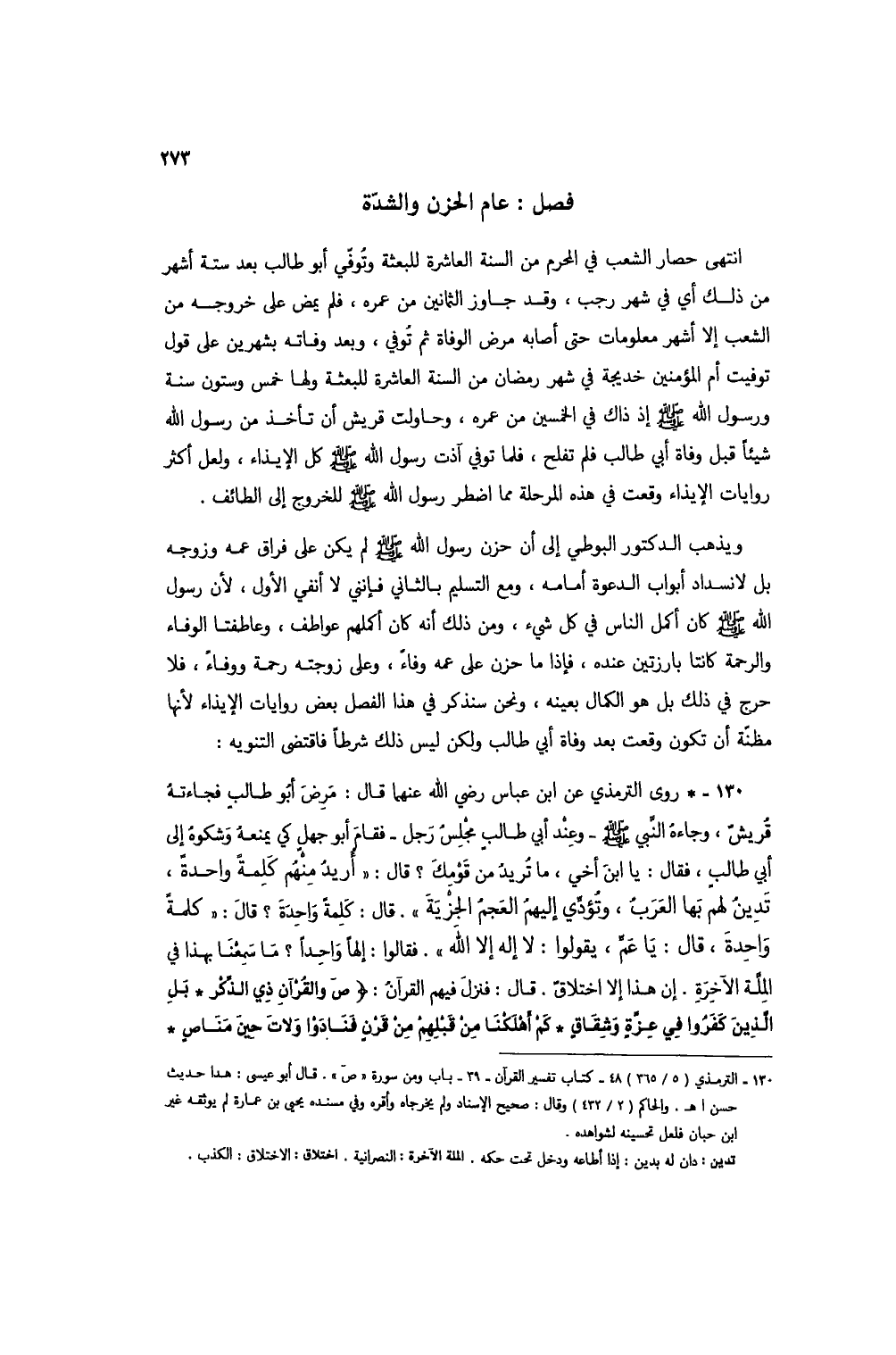 ويذهب الدكتور البوطي إلى أن حزن رسول الله صلى الله عليه وسلم لم يكن على فراق عمه وزوجه بل لانسداد أبواب الدعوة أمامه، ومع التسليم بالثاني فإنني لا أنفي الأول، لأن رسول الله صلى الله عليه وسلم كان أكمل الناس في كل شيء، ومن ذلك أنه كان أكملهم عواطف، وعاطفتا الوفاء والرحمة كانتا بارزتين عنده، فإذا ما حزن على عمه وفاءً، وعلى زوجته رحمة ووفاء، فلا حرج في ذلك بل هو الكمال بعينه، ونحن سنذكر في هذا الفصل بعض روايات الإيذاء لأنها مظنة أن تكون وقعت بعد وفاة أبي طالب ولكن ليس ذلك شرطاً فاقتضى التنويه: