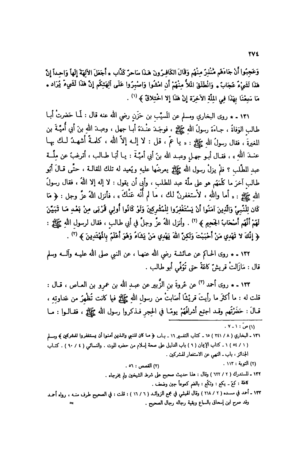 131 - * روى البخاري ومسلم عن المسيب بن حزنٍ رضي الله عنه قال: لما حضرتْ أبا طالب الوفاة، جاءه رسول الله صلى الله عليه وسلم، فوجد عنده أبا جهل، وعبد الله بن أبي أمية بن المغيرة، فقال رسول الله صلى الله عليه وسلم: "يا عم، قل: لا إله إلا الله، كلمة أشهدُ لك بها عند الله"، فقال أبو جهل وعبد الله بن أبي أمية: يا أبا طالب، أترغب عن ملة عبد المطلب؟ فلم يزل رسول الله صلى الله عليه وسلم يعرضها عليه ويُعيد له تلك المقالة، حتى قال أبو طالب آخر ما كلمهم هو على ملة عبد المطلب، وأبى أن يقول: لا إله إلا الله، فقال رسول الله صلى الله عليه وسلم: "أما والله، لأستغفرن لك، ما لم أنه عنك"، فأنزل الله عز وجل: {مَا كَانَ لِلنَّبِيِّ وَالَّذِينَ آمَنُوا أَنْ يَسْتَغْفِرُوا لِلْمُشْرِكِينَ وَلَوْ كَانُوا أُولِي قُرْبَى مِنْ بَعْدِ مَا تَبَيَّنَ لَهُمْ أَنَّهُمْ أَصْحَابُ الْجَحِيمِ} (2). وأنزل الله عز وجل في أبي طالب، فقال لرسول الله صلى الله عليه وسلم: {إِنَّكَ لَا تَهْدِي مَنْ أَحْبَبْتَ وَلَكِنَّ اللَّهَ يَهْدِي مَنْ يَشَاءُ وَهُوَ أَعْلَمُ بِالْمُهْتَدِينَ} (3).