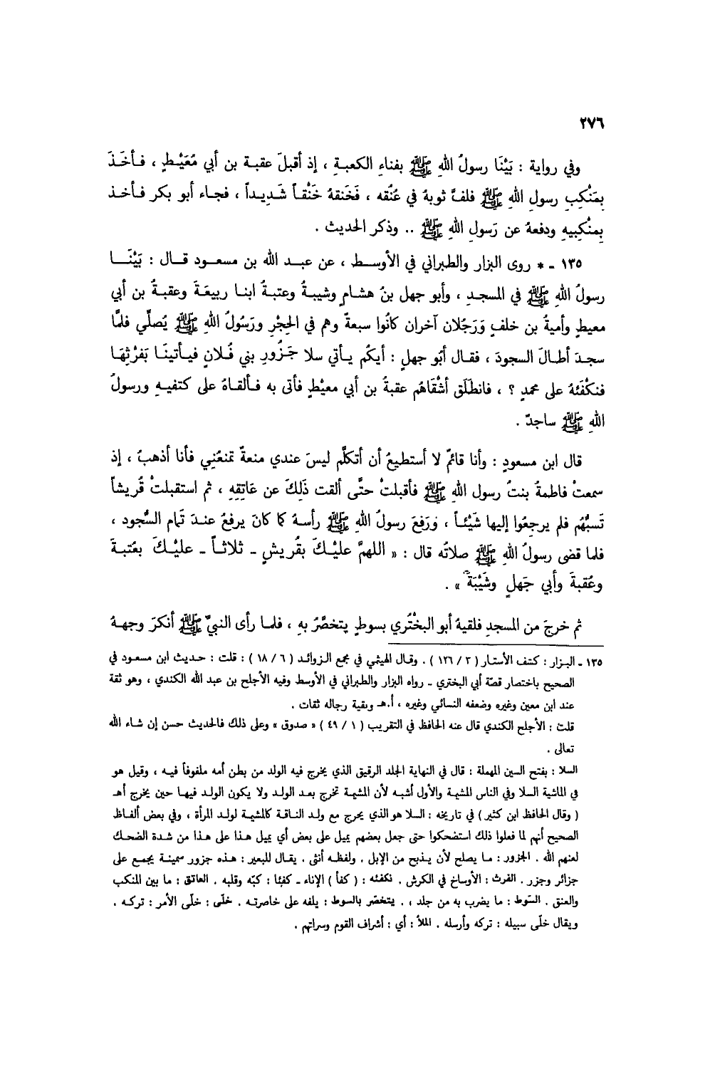 135 - * روى البزار والطبراني في الأوسط، عن عبد الله بن مسعود قال: بينا رسول الله صلى الله عليه وسلم في المسجد، وأبو جهل بن هشام وشيبة وعتبة ابنا ربيعة وعقبة بن ابي معيط وأمية بن خلف ورجلان آخران كانوا سبعة وهم في الحجر ورسول الله صلى الله عليه وسلم يصلي فلما سجد أطال السجود، فقال أبو جهل: أيكم يأتي سلا جزور بني فلان فيأتينا بغرثها فنكفئهُ على محمدٍ؟، فانطلق أشقاهم عقبة بن أبي معيطٍ فأتى به فألقاه على كتفيه ورسول الله صلى الله عليه وسلم ساجد.