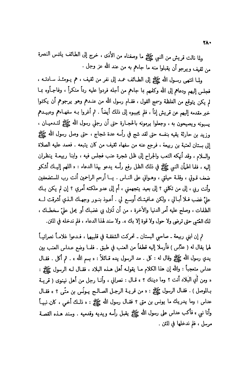 ولما انتهى رسول الله صلى الله عليه وسلم إلى الطائف عمد إلى نفر من ثقيف، هم يومئذ سادته، فجلس إليهم ودعاهم إلى الله وكلمهم بما جاءهم من أجله فردوا عليه رداً منكراً، وفاجأوه بما لم يكن يتوقع من الغلظة وسمج القول، فقام رسول الله من عندهم وهو يرجوهم أن يكتموا خبر مقدمه إليهم عن قريش إذاً، فلم يجيبوه إلى ذلك أيضاً. ثم أغروا به سفهاءهم وعبيدهم يسبونه ويصيحون به، وجعلوا يرمونه بالحجارة حتى أن رجلي رسول الله صلى الله عليه وسلم لتدميان، وزيد بن حارثة يقيه بنفسه حتى لقد شج في رأسه عدة شجاج، حتى وصل رسول الله صلى الله عليه وسلم إلى بستان لعتبة بن ربيعة، فرجع عنه من سفهاء ثقيف من كان يتبعه. فعمد عليه الصلاة والسلام، وقد أنهكه التعب والجراح إلى ظل شجرة عنب فجلس فيه، وابنا ربيعة ينظران إليه، فلما اطمأن النبي صلى الله عليه وسلم في ذلك الظل رفع رأسه يدعو بهذا الدعاء: "اللهم إليك أشكو ضعف قوتي وقلة حيلتي، وهواني على الناس. يا أرحم الراحمين أنت رب المستعضفين وأنت ربي، إلى من تكلني؟ إلى بعيد يتجهمني، أم إلى عدو ملكته أمري؟ إن لم يكن بك عليَّ غضب فلا أبالي، ولكن عافيتك أوسع لي. أعوذ بنور وجهك الذي أشرقت له الظلمات، وصلح عليه أمر الدنيا والآخرة، من أن تنزل بي غضبك أو يحل علي سخطك، لك العُتبى حتى ترضى ولا حول ولا قوة إلا بك". ولا سند لهذا الدعاء، فلم ندخله في المتن.